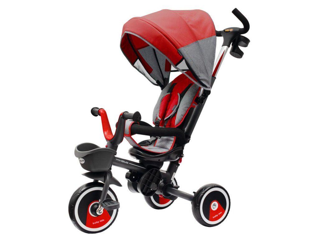 Detská šliapacia trojkolka Baby Mix 5v1 RELAX je multifunkčný dopravný prostriedok, je typickým príkladom produktov GROW UP - rastie zároveň s dieťaťom. Trojkolku môže ovládať ako dieťa, tak aj rodič pomocou nastaviteľnej vodiacej tyče. Po odobratí vodiacej tyče, sklápacej striešky, ktorá chráni pred slnkom alebo ostatných komponentov bude slúžiť ako trojkolka. Má moderný konštrukciu, pohodlné a ergonomicky tvarované sedadlo, ktoré je posuvné a otočné o 360 stupňov, čo umožní dieťaťu cestovať v smere alebo proti smeru jazdy. Je vyrobená z kvalitných a odolných materiálov a skladacia konštrukcia umožňuje bezproblémovú prepravu trojkolky napríklad v kufri auta. Jej skladanie je veľmi jednoduché, intuitívne a nevyžaduje žiadne náradie. O pohodlie a bezpečie počas jazdy sa stará odnímateľná hrazda, päťbodové bezpečnostné pásy, pohodlné stúpačky alebo kolesá vyrobené z tvrdenej peny EVA, ktoré skvele absorbujú nárazy, poskytujú perfektnú priľnavosť a nevyžadujú hustenie. Pre uloženie hračiek alebo potrieb pre dieťa je tu praktický úložný košík.