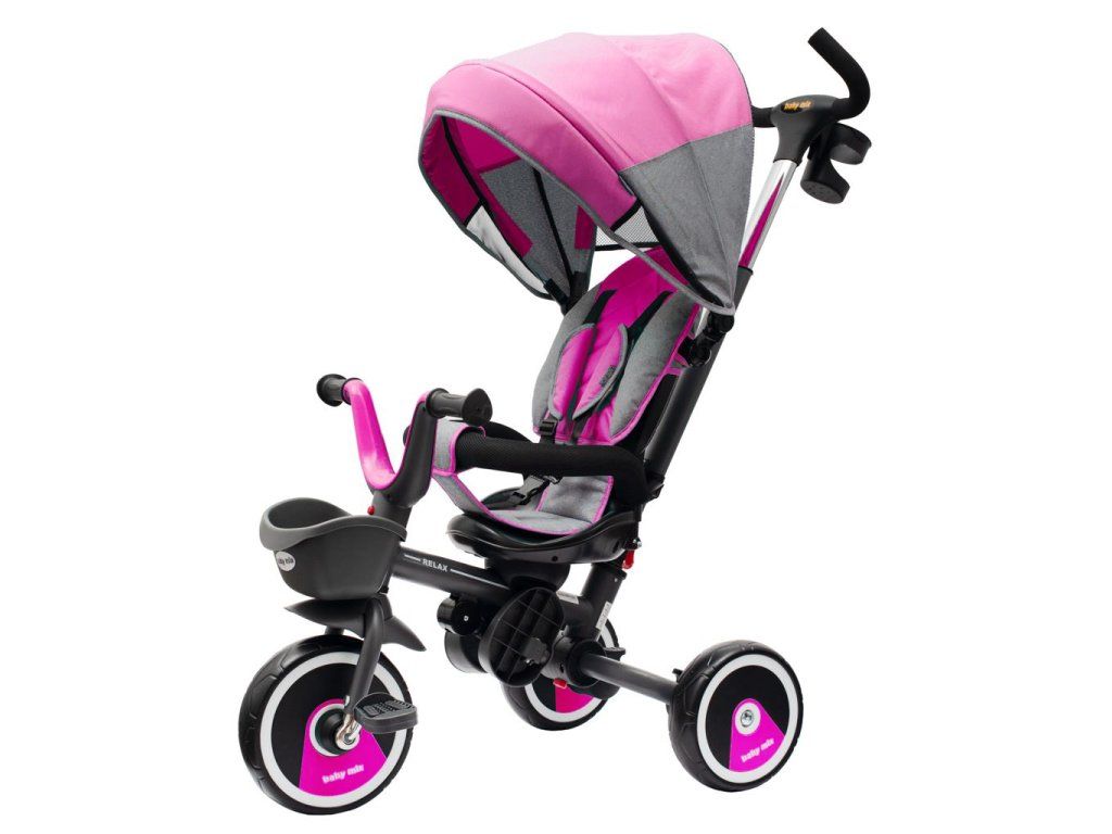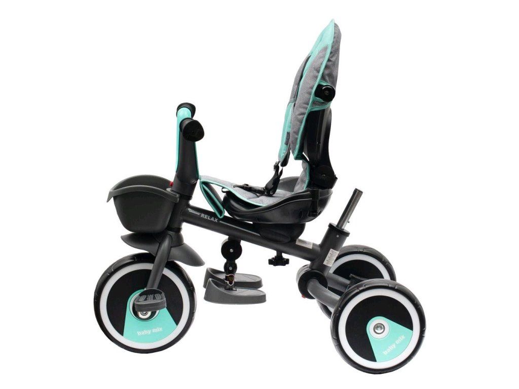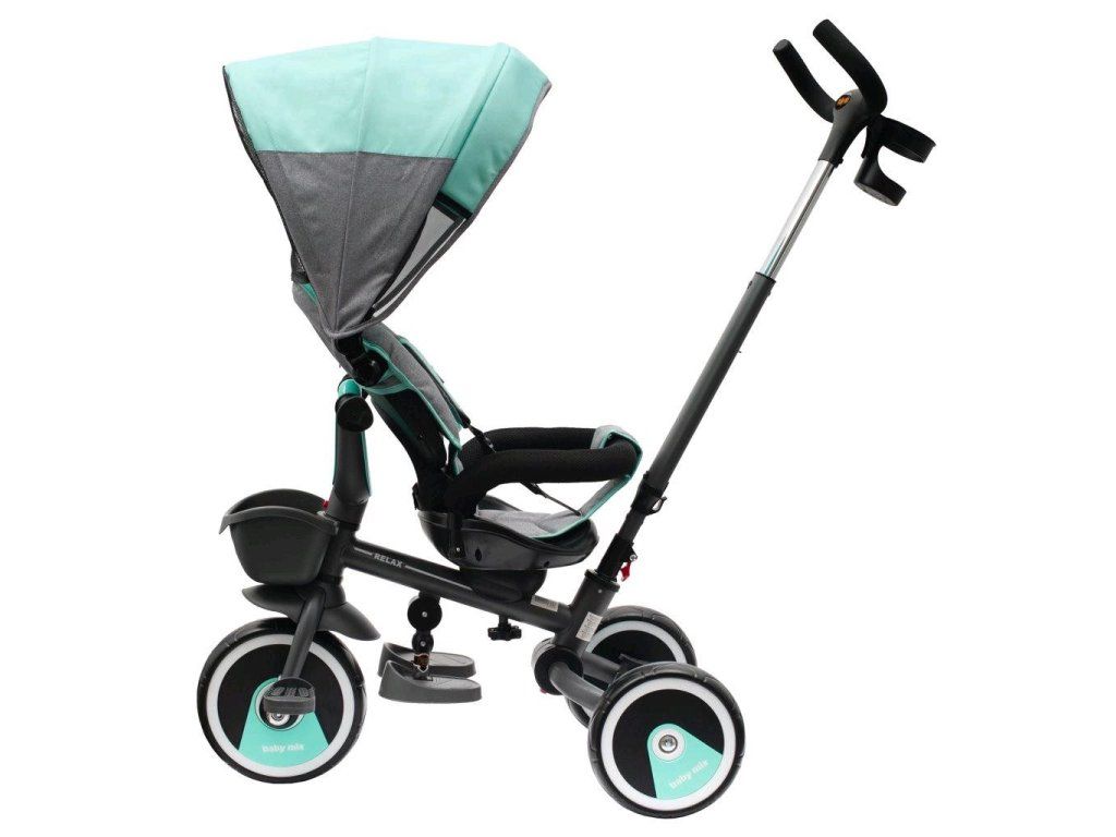 Detská šliapacia trojkolka Baby Mix 5v1 RELAX je multifunkčný dopravný prostriedok, je typickým príkladom produktov GROW UP - rastie zároveň s dieťaťom. Trojkolku môže ovládať ako dieťa, tak aj rodič pomocou nastaviteľnej vodiacej tyče. Po odobratí vodiacej tyče, sklápacej striešky, ktorá chráni pred slnkom alebo ostatných komponentov bude slúžiť ako trojkolka. Má moderný konštrukciu, pohodlné a ergonomicky tvarované sedadlo, ktoré je posuvné a otočné o 360 stupňov, čo umožní dieťaťu cestovať v smere alebo proti smeru jazdy. Je vyrobená z kvalitných a odolných materiálov a skladacia konštrukcia umožňuje bezproblémovú prepravu trojkolky napríklad v kufri auta. Jej skladanie je veľmi jednoduché, intuitívne a nevyžaduje žiadne náradie. O pohodlie a bezpečie počas jazdy sa stará odnímateľná hrazda, päťbodové bezpečnostné pásy, pohodlné stúpačky alebo kolesá vyrobené z tvrdenej peny EVA, ktoré skvele absorbujú nárazy, poskytujú perfektnú priľnavosť a nevyžadujú hustenie. Pre uloženie hračiek alebo potrieb pre dieťa je tu praktický úložný košík.