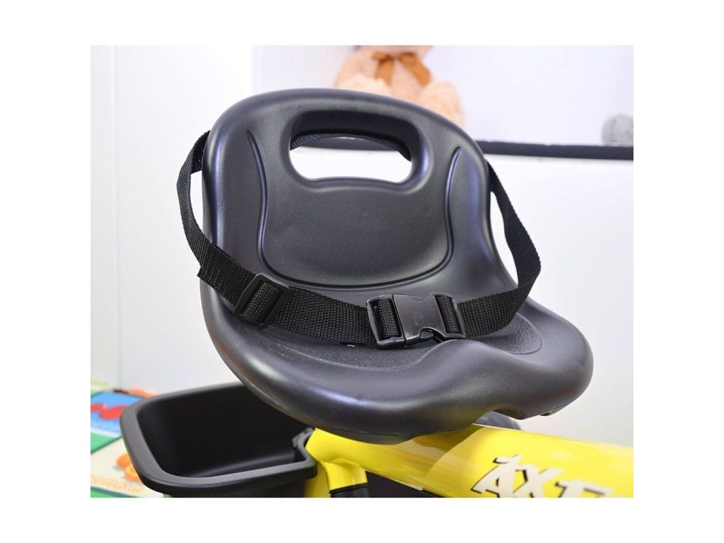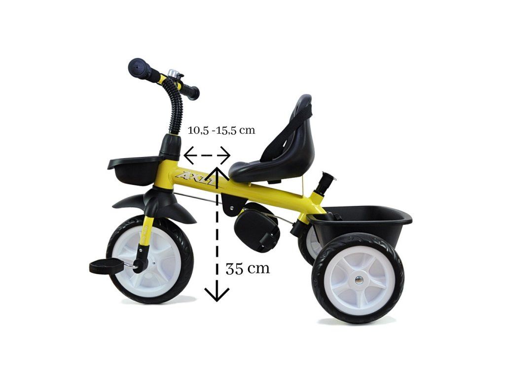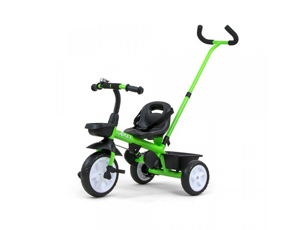 Detská šliapacia trojkolka s rukoväťou Axel je určená pre deti vo veku od 1 do 3 rokov. Je vyrobená z kvalitných a odolných materiálov. Má pohodlné a ergonomicky tvarované sedadlo, kde vzdialenosť k riadidlám možno ľahko nastaviť a tým prispôsobiť trojkolku veku a výške dieťaťa. Trojkolka patrí k produktom skupiny GROW UP, teda rastie s dieťaťom. Na prednom kolese je možné uvoľniť náhon na pedále a pomocou vodiacej tyče tlačiť malého pretekára, keď mu dôjdu sily. Široké kolesá vyrobené z tvrdenej peny EVA, zaručí pohodlie a odolnosť na každom povrchu. Do dvoch praktických košíkov si váš malý pretekár naskladá všetky potrebné hračky a môže vyraziť v ústrety dobrodružstvám. Kombinácia kovovej konštrukcie a súčiastok vyrobených z najkvalitnejších materiálov zaručuje odolnosť za všetkých podmienok. Pre maximálne bezpečie dieťaťa má trojkolka trojbodové bezpečnostné pásy.
