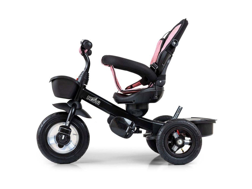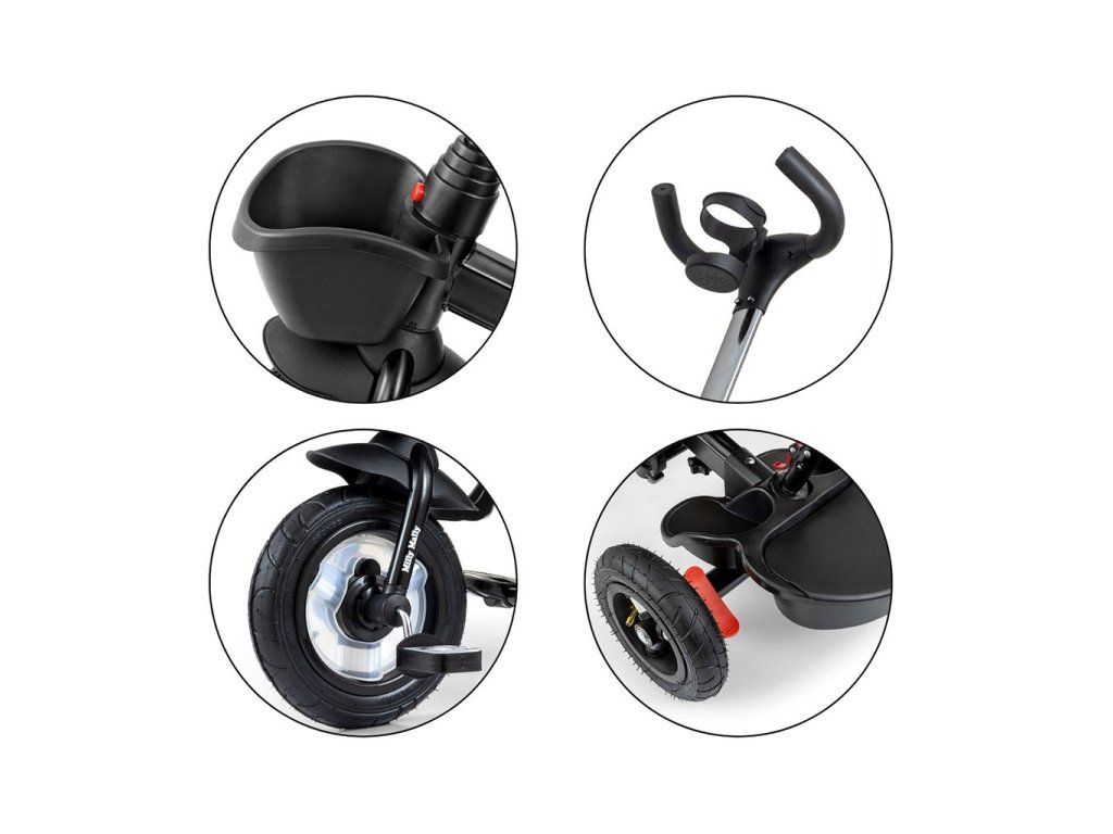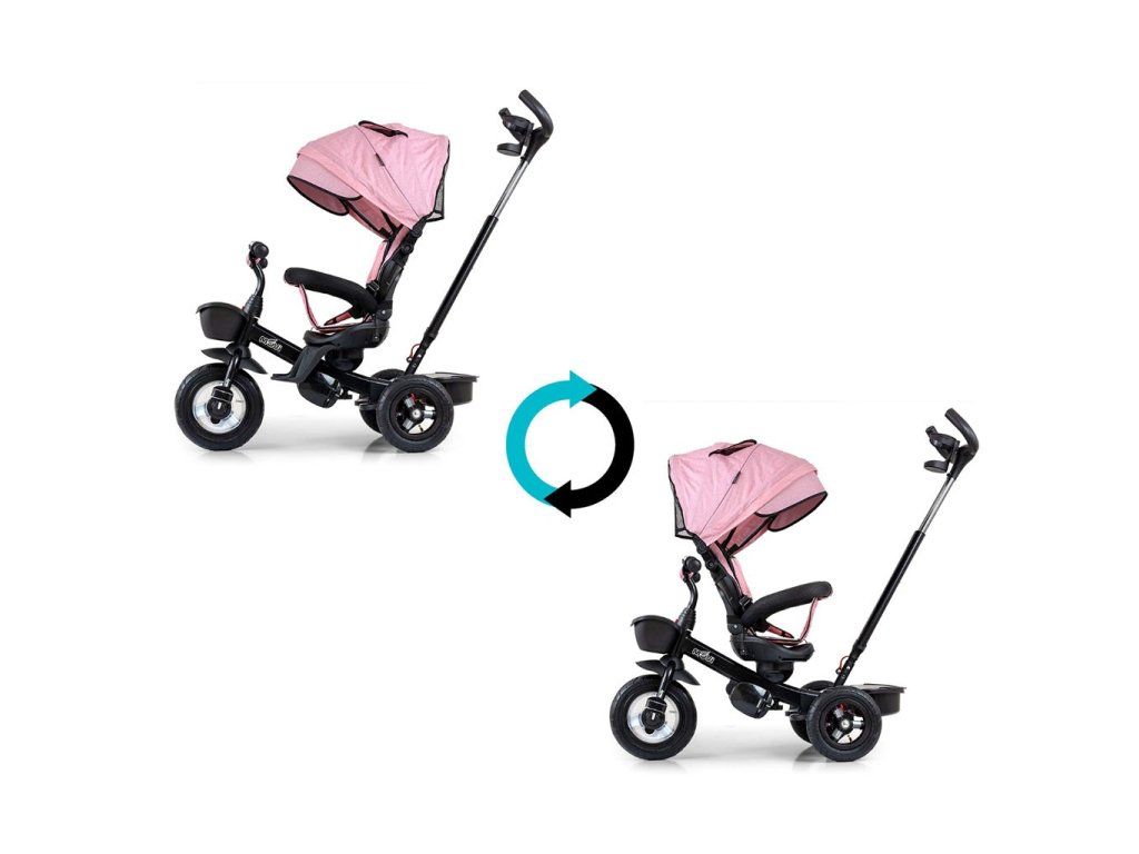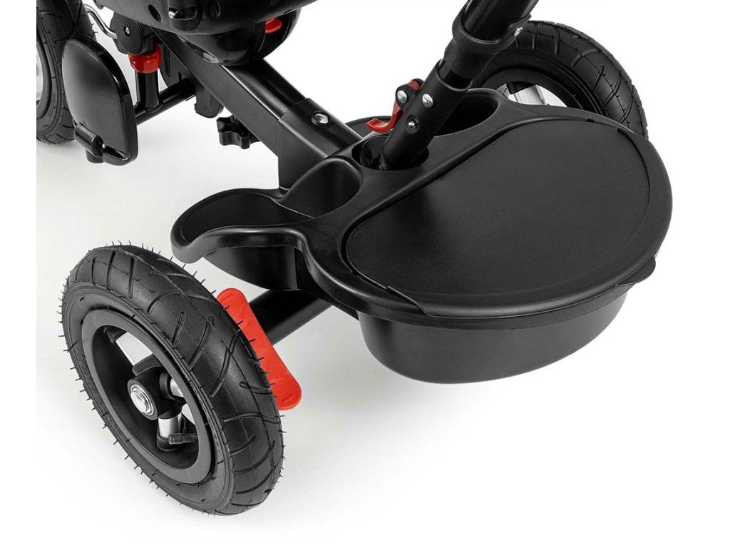 Je vyrobená z kvalitných a odolných materiálov. Má modernú konštrukciu, pohodlné a ergonomicky tvarované sedadlo, ktoré je otočné o 360 stupňov, čo umožní dieťaťu cestovať v smere alebo proti smeru jazdy. O pohodlie a bezpečie počas jazdy sa starajú bariérky, trojbodové bezpečnostné pásy, pohodlné stúpatka, alebo veľké nafukovacie kolesá, ktoré skvele absorbujú nárázy a poskytujú dobrú priľnavosť. Trojkolku môže ovládať ako dieťa, tak aj rodič pomocou nastaviteľnej rukoväte pre tlačenie. Po odobratí vodiacej tyče, sklápacej striešky, ktorá chráni pred slnkom alebo ostatných komponentov bude slúžiť ako trojkolka. Trojkolku je možné používať aj ako alternatívu golfového kočíka. Pre uloženie hračiek, alebo potrieb pre dieťa je tu praktický úložný košík.
