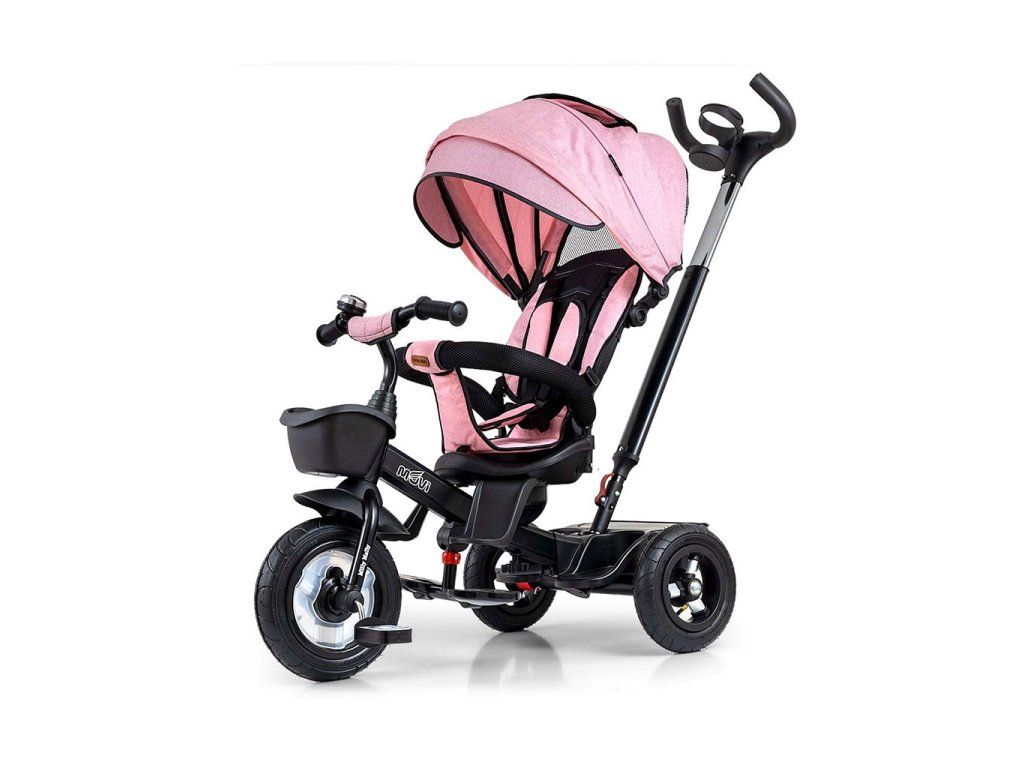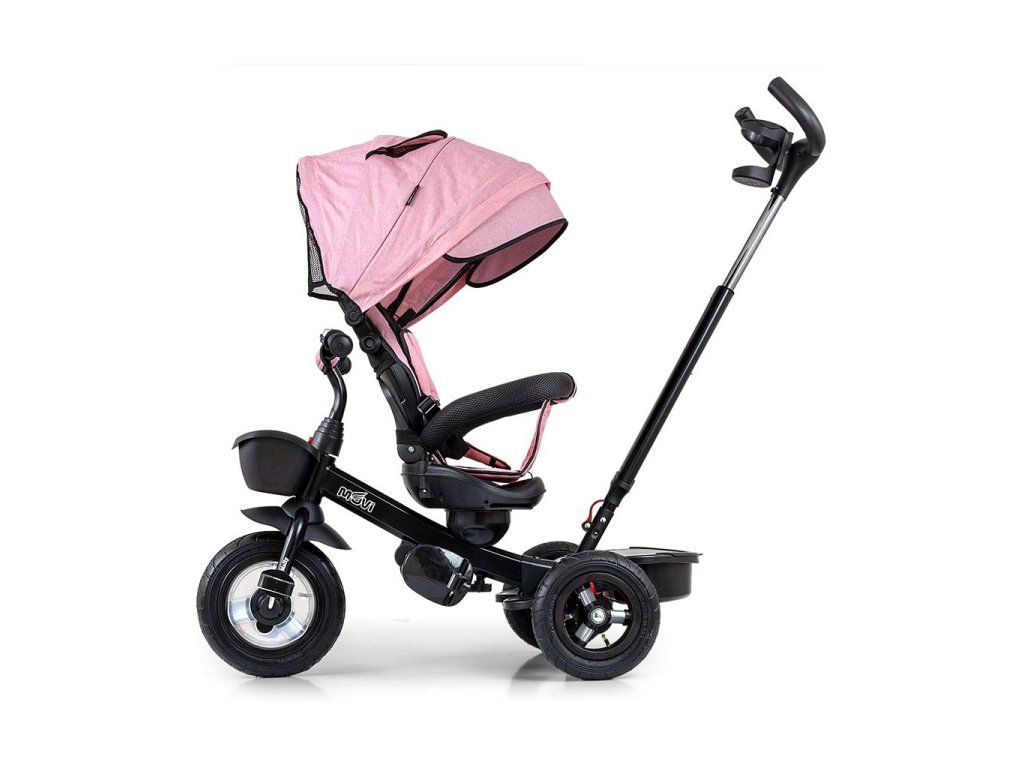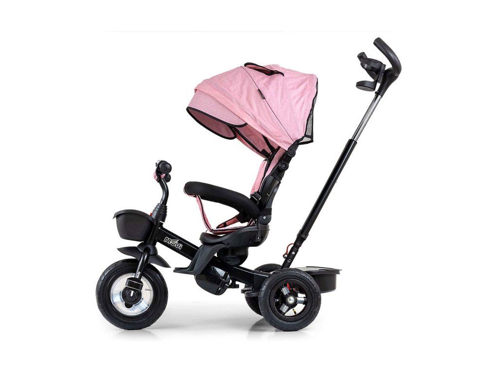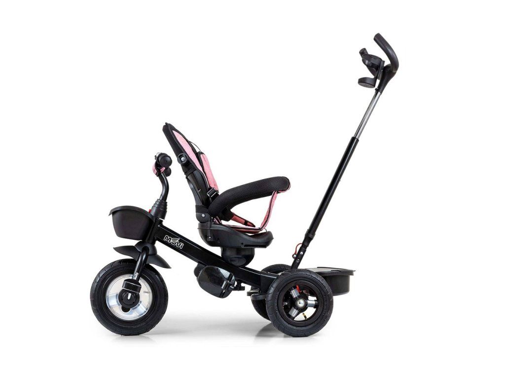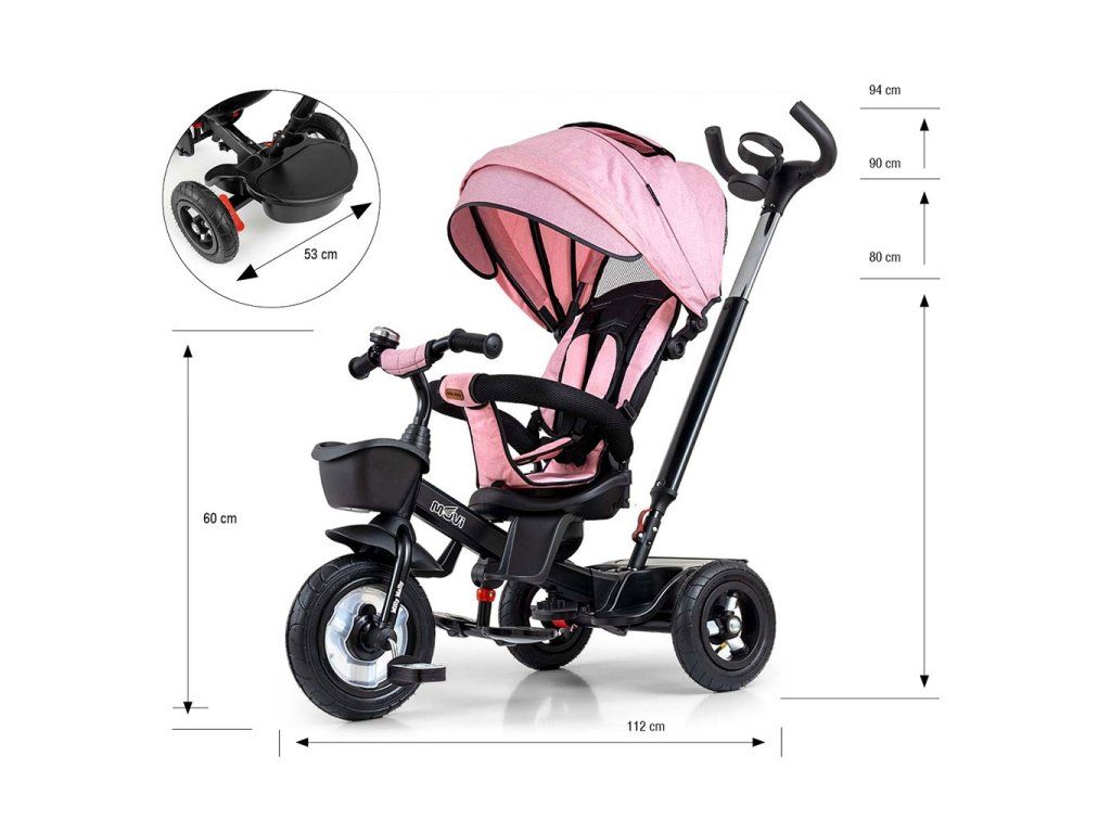 Je vyrobená z kvalitných a odolných materiálov. Má modernú konštrukciu, pohodlné a ergonomicky tvarované sedadlo, ktoré je otočné o 360 stupňov, čo umožní dieťaťu cestovať v smere alebo proti smeru jazdy. O pohodlie a bezpečie počas jazdy sa starajú bariérky, trojbodové bezpečnostné pásy, pohodlné stúpatka, alebo veľké nafukovacie kolesá, ktoré skvele absorbujú nárázy a poskytujú dobrú priľnavosť. Trojkolku môže ovládať ako dieťa, tak aj rodič pomocou nastaviteľnej rukoväte pre tlačenie. Po odobratí vodiacej tyče, sklápacej striešky, ktorá chráni pred slnkom alebo ostatných komponentov bude slúžiť ako trojkolka. Trojkolku je možné používať aj ako alternatívu golfového kočíka. Pre uloženie hračiek, alebo potrieb pre dieťa je tu praktický úložný košík.