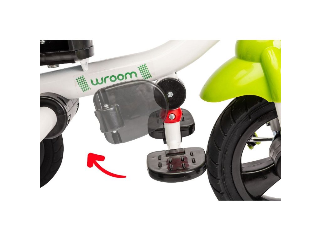Detská šliapacia trojkolka Wroom s otočným sedadlom je pohodlná trojkolka, ktorú možno použiť dvoma spôsobmi: dieťa sa môže voziť dopredu alebo dozadu proti smeru jazdy a nohy mať položené na sklopnej opierke alebo dopredu jazdiť samo. Rozpojovacia zábrana uľahčuje nasadnutie a jej mäkké polstrovanie zaisťuje bezpečnosť a pohodlie pri jazde. V zadnej časti je košík na drobné predmety a rukoväť pre riadenie s dvojstupňovým nastavením výšky. Trojkolka má kolesá z peny, takže sa nemusíte starať o nafukovanie alebo obávať prepichnutých pneumatík. Obe zadné kolesá majú samostatné brzdy. Skladacia konštrukcia uľahčuje prepravu v kufri a jej skladovanie, keď sa nepoužíva.