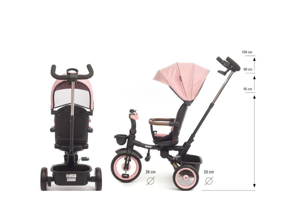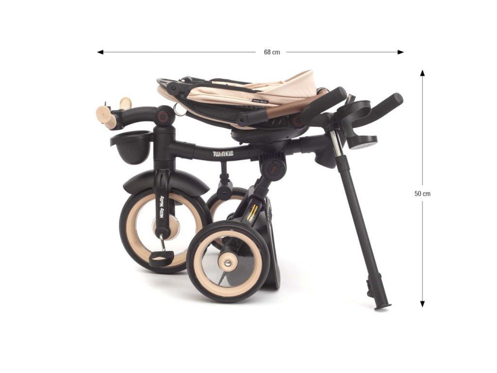 Twinkle je vybavená nastaviteľnou rukoväťou, funkciou voľnobehu, brzdou, bezpečnostnými pásmi s chráničmi a pohodlným trojpolohovým operadlom a zaručuje úplnú kontrolu a pohodlie pre dieťa aj rodičov. Jej ľahký, ale odolný oceľový rám, kolesá s penovou výplňou a guličkovými ložiskami, skladacia konštrukcia a praktické prvky, ako je sieťovaná strieška, LED svetlo, držiak na nápoje a dva úložné boxy, z nej robí perfektnú voľbu pre každú príležitosť - v meste, na prechádzke alebo na výlete. Po odstránení rukoväte, koľajníc a striešky je možné Twinkle používať ako klasickú trojkolku.
