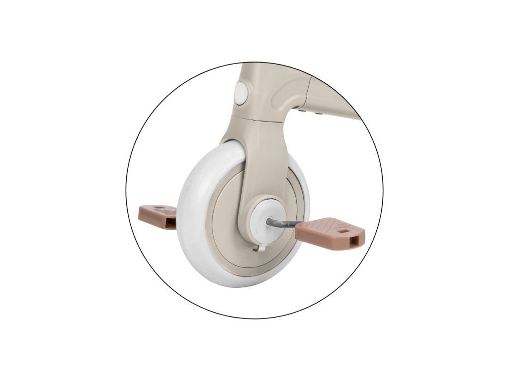 Na začiatku poslúži ako stabilná trojkolka (s možnosťou upevniť dve kolieska vpredu alebo vzadu) – ideálna pre malých začiatočníkov, ktorí ešte len hľadajú rovnováhu a učia sa dôverovať vlastným nohám. Keď dieťa trochu podrastie a začne byť v pohybe istejšie, Bingo sa dá jednoducho prestavať na klasické balančné odrážadlo. V tejto fáze sa už odráža samo, reguluje si rýchlosť a trénuje koordináciu aj smer. A keď príde správny čas, stačí nasadiť pedále – Bingo sa zmení na ich prvý bicykel, na ktorom môžu skúsiť prvé šliapanie. Všetko sa dá zvládnuť jednoducho a bez náradia – len pár pohybov a je hotovo.