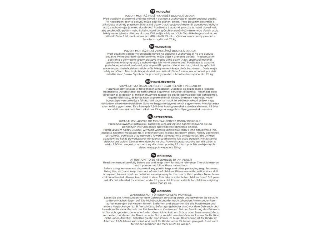 UPOZORNENIE! Montáž musí vykonávať dospelá osoba! Pred použitím si pozorne prečítajte návod na obsluhu a uschovajte si ho pre budúce použitie. Pri nedodržaní týchto pokynov môže dôjsť k zraneniu dieťaťa. Pred použitím odstráňte a zlikvidujte všetky plastové vrecká a obaly a uchovávajte ich mimo dosahu detí. Používajte produkt opatrne, pretože je potrebná zručnosť, aby sa predišlo pádom alebo kolíziám, ktoré by spôsobili zranenie používateľa alebo tretích osôb. Nikdy nenechávajte dieťa bez dozoru. Dieťa majte vždy na očiach. Táto trojkolka je vhodná pre deti od 1,5 do 5 rokov, nie je určená pre deti mladšie ako 1,5 roka. Výrobok nie je vhodný pre deti s hmotnosťou vyššou ako 25 kg.