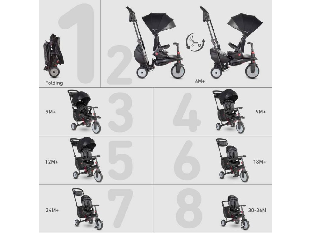 Táto trojkolka 8v1 má 8 stupňov používania, takže rastie s vašim dieťaťom od jej používania ako kočíka až po okamih, keď dieťa samo vedie svoju obľúbenú trojkolku, rozvíja motorické schopnosti, istotu, koordináciu a nezávislosť v rovnaký čas. Malé deti sa môžu naučiť ovládať a šliapať do pedálov, zatiaľ čo rodičia majú kontrolu nad tým, ktorým smerom sa trojkolka uberá. Vďaka tomu dieťa získa dve najdôležitejšie zručnosti potrebné na riadenie trojkolky bez obáv, že spadne a odradí ho od ďalšej jazdy.