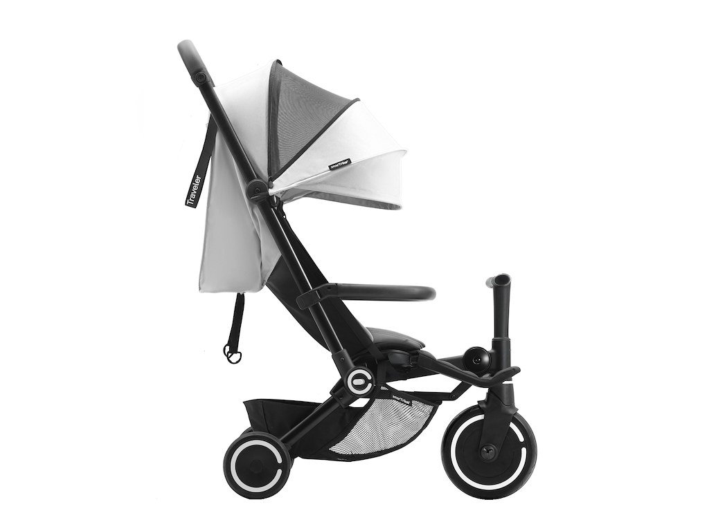 Akonáhle sú deti pripravené riadiť, jediným stlačením tlačidla sa Traveller stane nezávislou detskou trojkolkou navrhnutou pre roky jazdy.