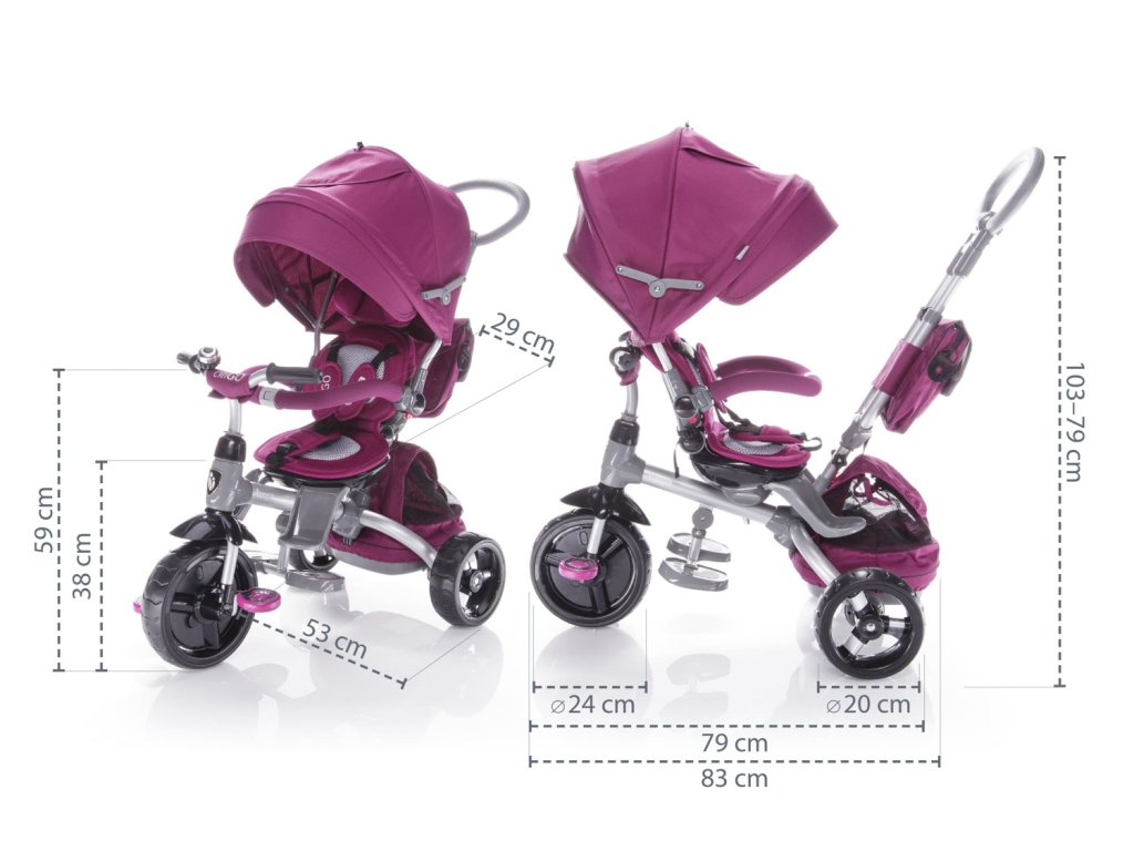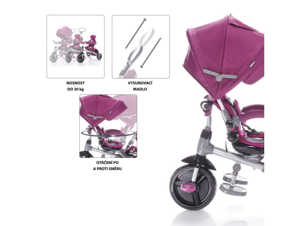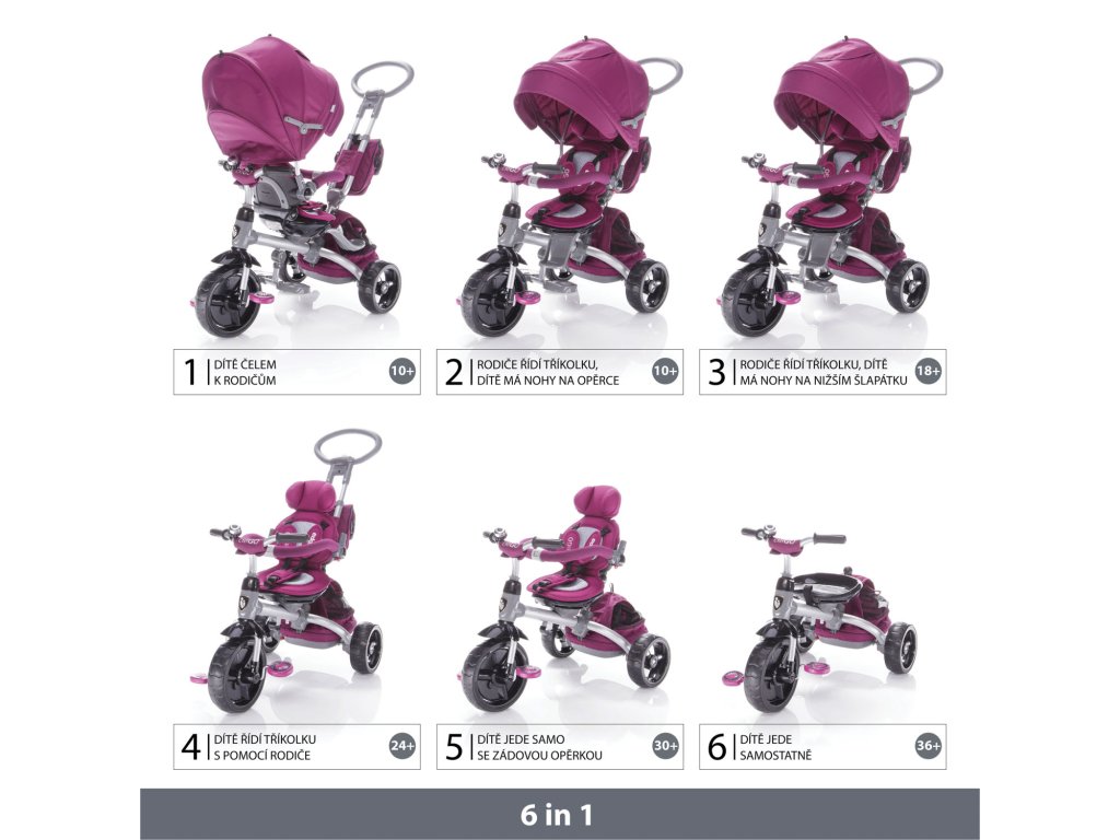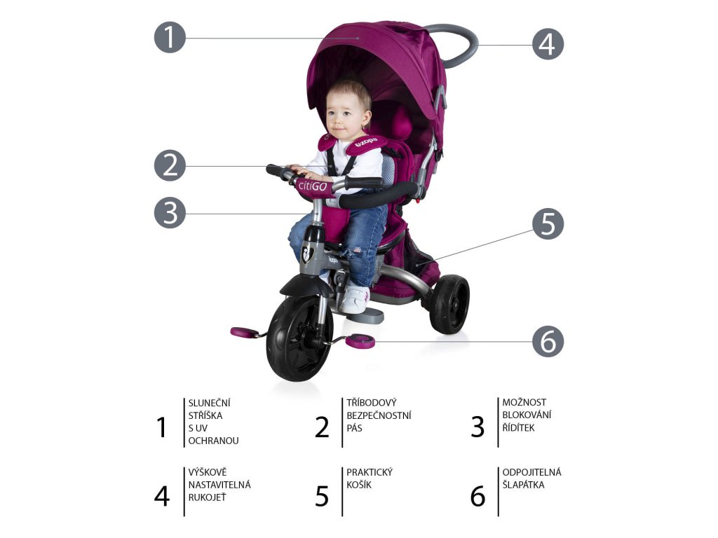Luxusná trojkolka CITIGO je určená pre deti od 10 mesiacov do 3 rokov. Ľahko sa ovláda pomocou výškovo nastaviteľnej vodiacej tyče. Sedadlo je možné otočiť v smere a do protismeru, aby menšie deti nestrácali kontakt s rodičom. Pomocou polohovania chrbtovej opierky ľahko dieťaťu nastavíte najpohodlnejšiu polohu. Dlhá strecha chráni dieťatko pred rozmarmi počasia. Kvalitná pohodlné polstrovanie z priedušných materiálov zabraňuje nadmernému poteniu dieťaťa. Vďaka unikátnej konštrukcii máte na výber 6 typov použitia podľa aktuálneho veku a schopností dieťatka tak, aby ho trojkolka stále bavila.