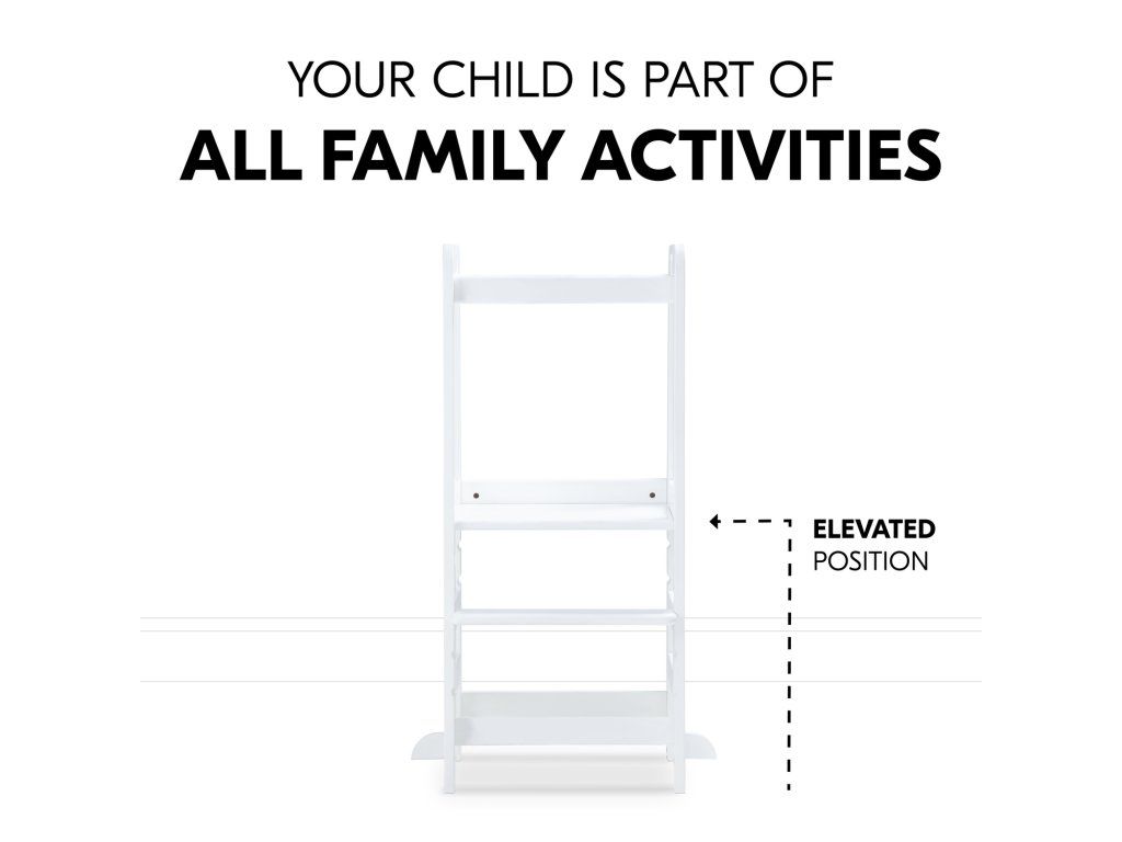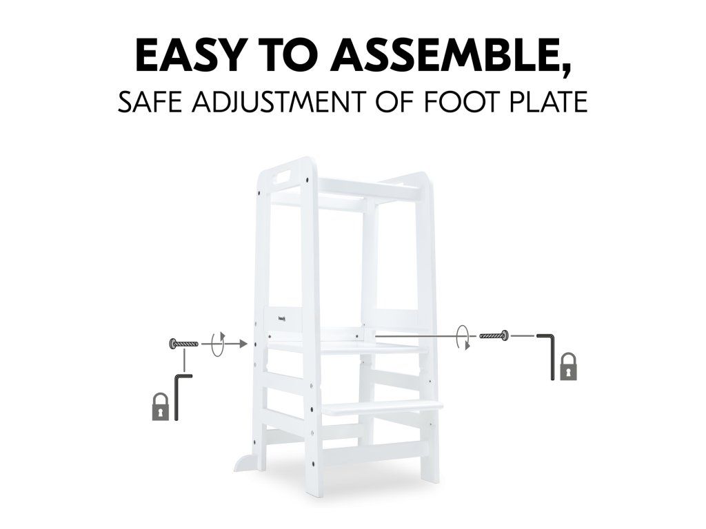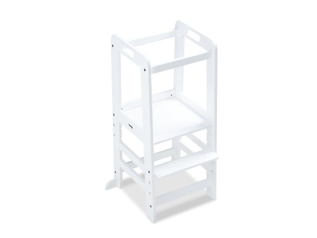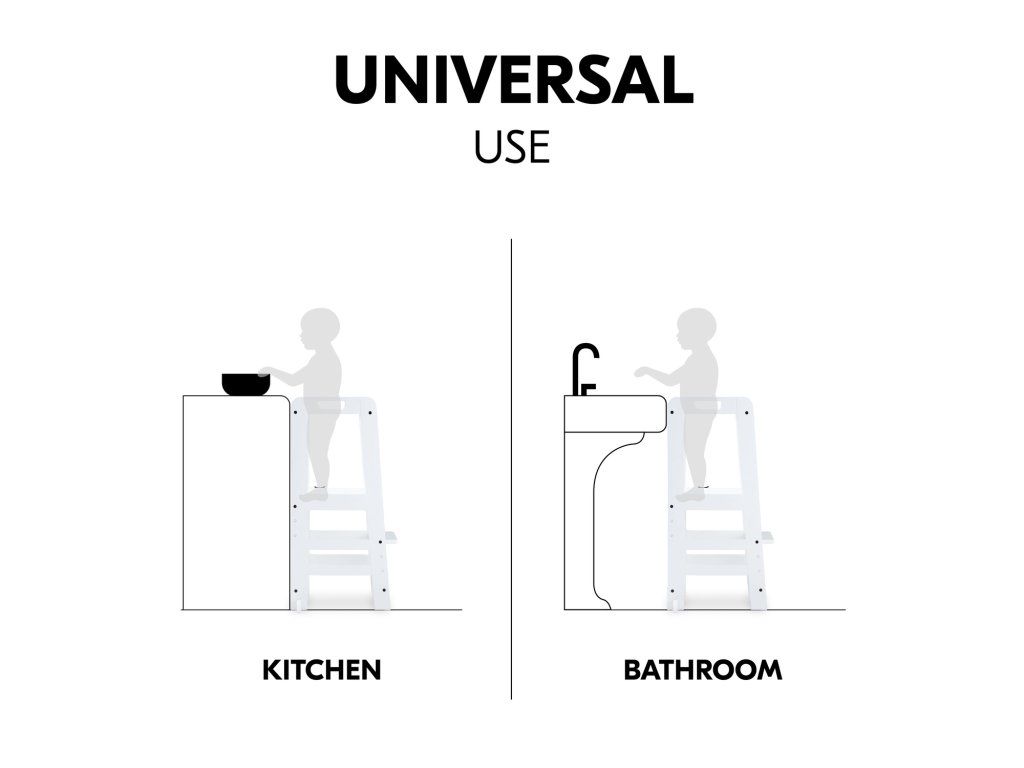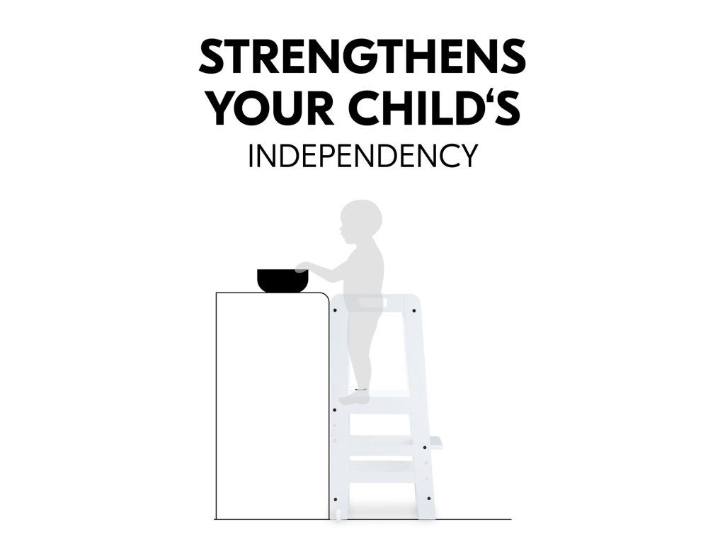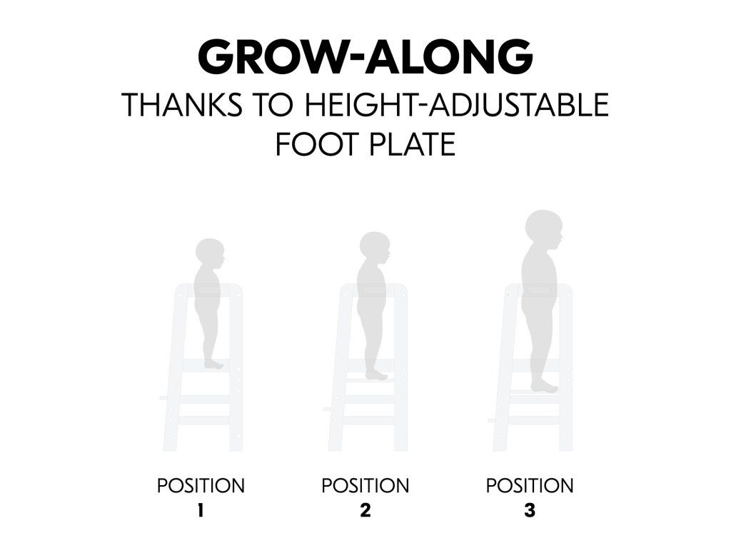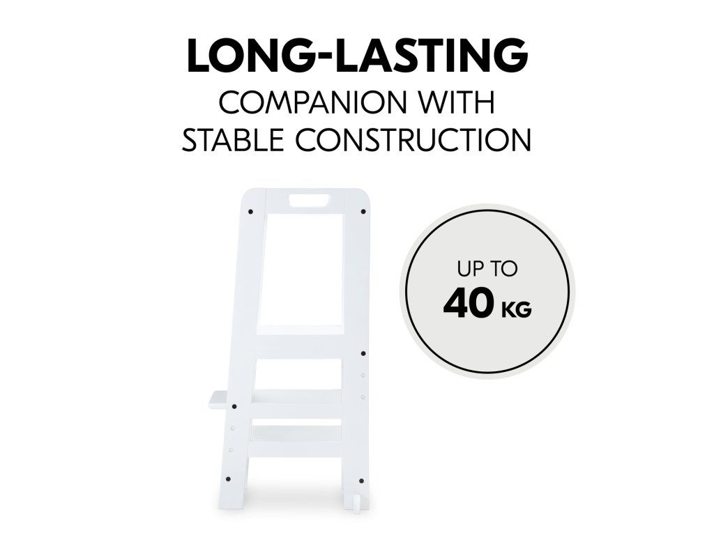 V závislosti od veľkosti vášho dieťaťa môžete nastaviť výšku nožičiek kuchynského pomocníka do troch rôznych výšok. Robustná a stabilná konštrukcia umožňuje vášmu dieťaťu používať vežu Montessori až do hmotnosti 40 kg, či už v kuchyni, pri jedálenskom stole alebo pri umývadle v kúpeľni.