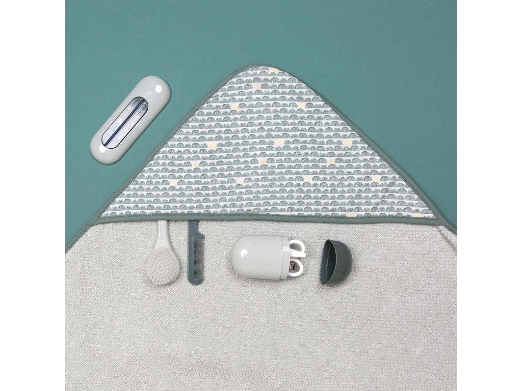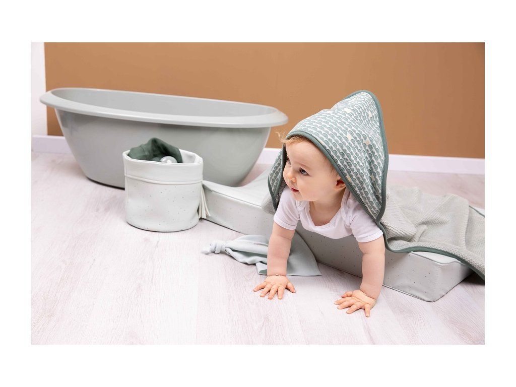 Tento mäkký uterák s kapucňou je vyrobený zo 100% bavlny a rýchlo absorbuje vlhkosť, takže môžete ľahko svoje dieťa po kúpaní vysušiť. Uterák tvorí základ výrobkov na kúpanie a starostlivosť, s ktorými sa dá dokonale farebne kombinovať.