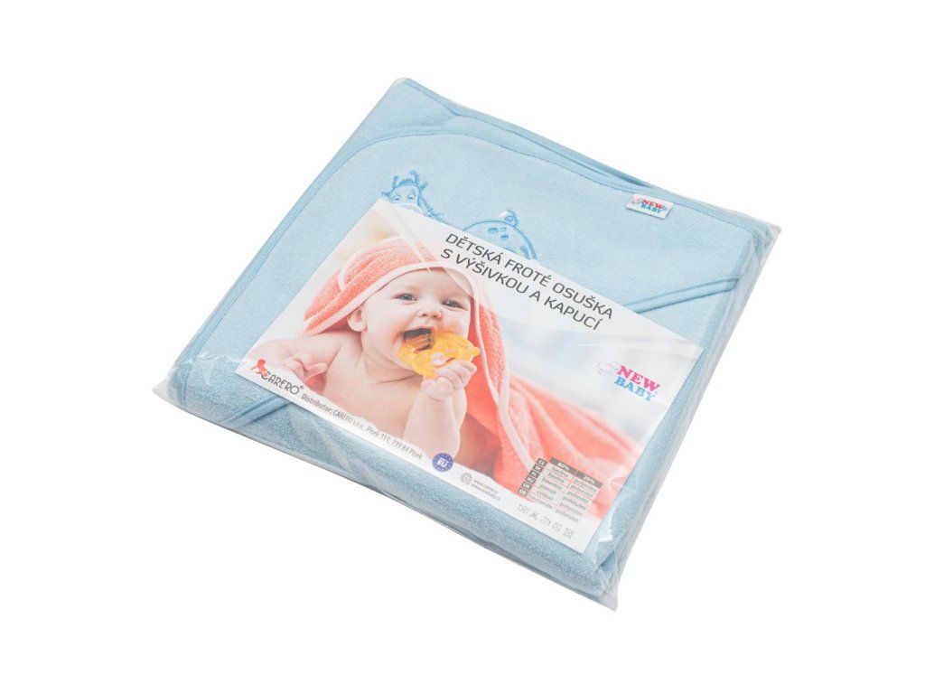 Krásna detská froté osuška New Baby je vyrobená z mäkkého, kvalitného a veľmi savého materiálu a preto je ideálna pre bábätká i staršie deti. Osuška krásne zahreje po kúpeli a praktická kapucňa chráni hlavičku dieťatka pred nepríjemným chladom. Osuška dokonale absorbuje vlhkosť, pričom veľmi rýchlo schne. Zdobí ju veselý obrázok zvieratka. P> Zloženie: 80% bavlna, 20% polyester
