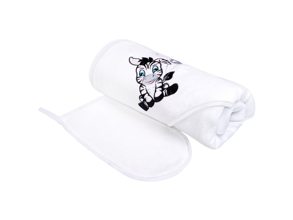 Jemná luxusná detská osuška New Baby. Osuška je s kapucňou, je obojstranná a vyrobená z príjemného a vysoko savého froté materiálu. Z jednej strany je froté materiál, na ktorom je vyšitý obrázok roztomilej zebry, druhá strana je vyrobená z hrejivého plyšu. Po celej dĺžke osušky je biely lem. Jej súčasťou je aj umývacia froté žinka. Rozmery cca: 90x90 cm. Zloženie: 85% bavlna a 15% polyester.Dodatočné parametre