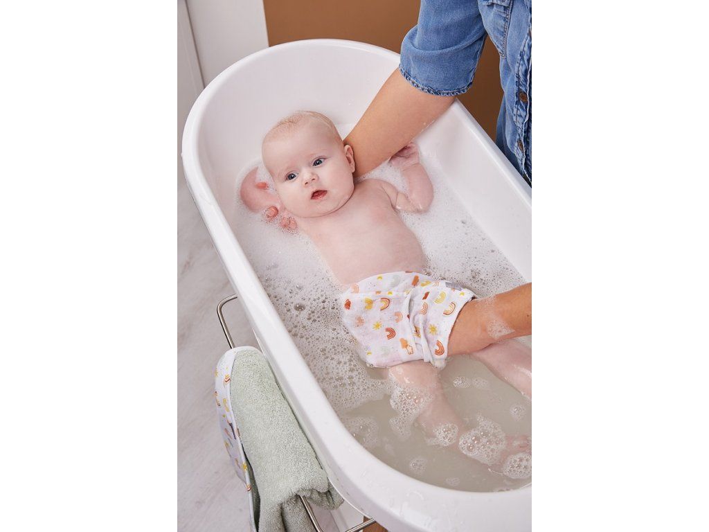 Veľmi stabilný vaňový stojan Sense má nohy vyrobené z lakovaného bukového dreva s certifikáciou FSC. To dodáva stojanu teplý moderný vzhľad. Je vybavený praktickými pomôckami; vpredu je pripevnený držiak na uteráky. Priestranná plastová polička poskytuje dostatok miesta napríklad na šampón, žinku, vodné hračky alebo kúpací gél. To znamená, že máte po ruke všetky potrebné veci, aby ste si s malým mohli v pokoji kúpanie užiť. Inovatívny systém upevnenia zaisťuje, že vaňu možno ľahko pripevniť k stojanu a rovnako ľahko sňať. Po kliknutí môžete svoje bábätko nerušene a bezpečne kúpať.