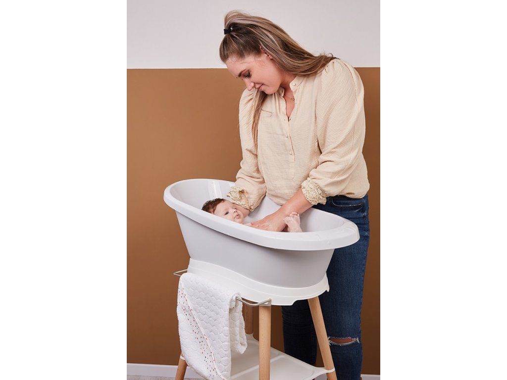 Veľmi stabilný vaňový stojan Sense má nohy vyrobené z lakovaného bukového dreva s certifikáciou FSC. To dodáva stojanu teplý moderný vzhľad. Je vybavený praktickými pomôckami; vpredu je pripevnený držiak na uteráky. Priestranná plastová polička poskytuje dostatok miesta napríklad na šampón, žinku, vodné hračky alebo kúpací gél. To znamená, že máte po ruke všetky potrebné veci, aby ste si s malým mohli v pokoji kúpanie užiť. Inovatívny systém upevnenia zaisťuje, že vaňu možno ľahko pripevniť k stojanu a rovnako ľahko sňať. Po kliknutí môžete svoje bábätko nerušene a bezpečne kúpať.