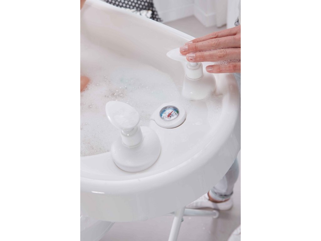 Unikátna termovanička Bébé-Jou s monitorovaním teploty vody a dávkovačom mydla a šampónu. Komfortná a starostlivo konštruovaná termovanička Bébé-jou je vybavená inovatívnym Click systémom pre ešte väčšiu bezpečnosť a pohodlie pri kúpaní. Len 2 kliknutia a vanička je ľahko a bezpečne umiestnená na kúpací stojan. Rovnako ľahko môže byť pomocou kliknutia vanička zo stojana odpojená.