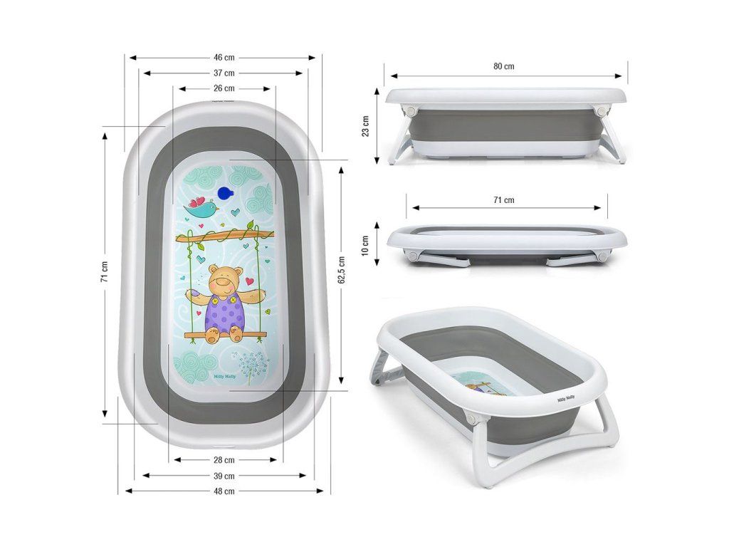 Detská skladacia vanička Milly Mally AQUA je praktickým a univerzálnym riešením do každej domácnosti bez ohľadu na veľkosť kúpeľne. Stačí zložiť nohy a potom silikónové dno. Je mimoriadne kompaktná a pohodlná. Produkt je kombináciou funkčnosti a moderného designu. Je ľahká, odolná a vďaka protišmykovým skladacím nohám predovšetkým stabilná. Boky vaničky sú vyrobené z mäkkého a na dotyk veľmi príjemného plastu a sú pre dieťa úplne bezpečné, nespôsobujú alergie a ľahko sa udržujú v čistote. Silikónové dno vaničky je vybavené dômyselnou termo citlivou zátkou, ktorá mení farbu podľa teploty vody (po prekročení 37°C sa farba zátky zmení). Pri teplote vody nad 41°C je zátka úplne priehľadná. Nezabudnite pred kúpaním vždy skontrolovať teplotu vody.