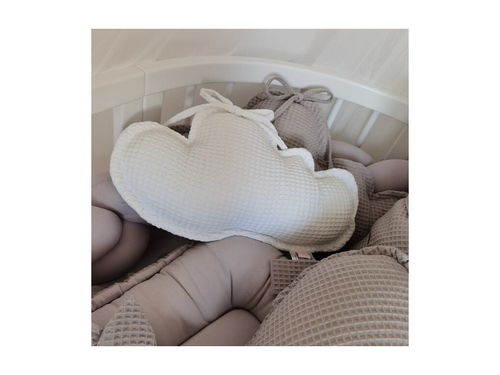 Vankúš Oblak vafle je skvelá voľba, pretože svojim tvarom zaujme dieťatko už od útleho veku. Povrch vankúša je úžasná bavlna vafle a je zaujímavý jemným lemom po celom obvode a mašličkou z rovnakého materiálu. Vankúš viete doladiť k ďalším textíliám, ako sú plachty, baldachýn, či nebesá. K vankúšu Oblak doporučujeme kúpu našej detskej deky so strapcami s ktorou sa viete materiálovo aj farebne perfektne zladiť.