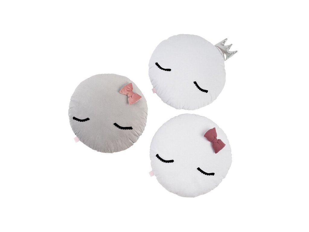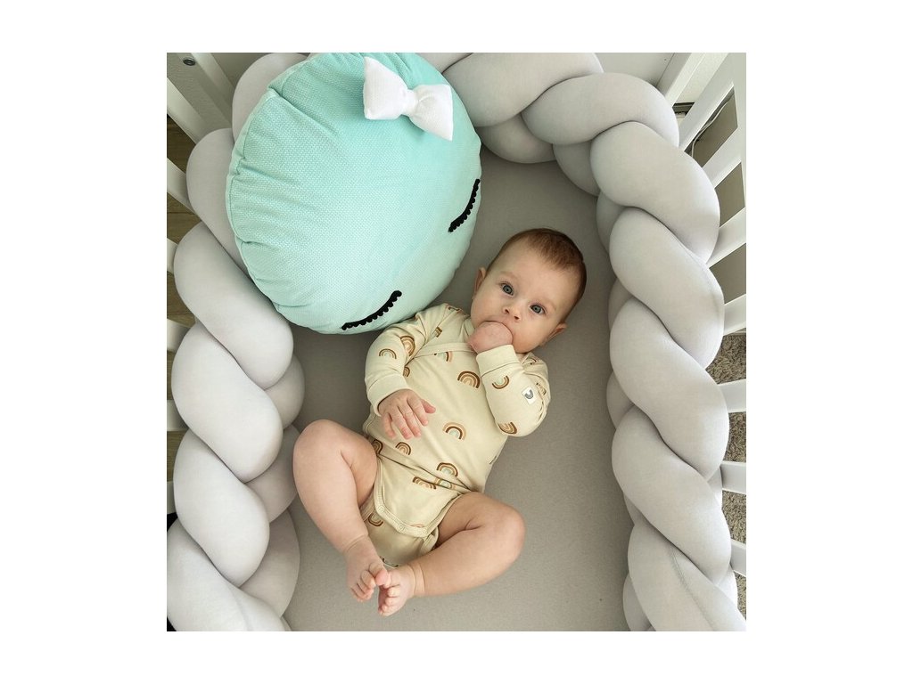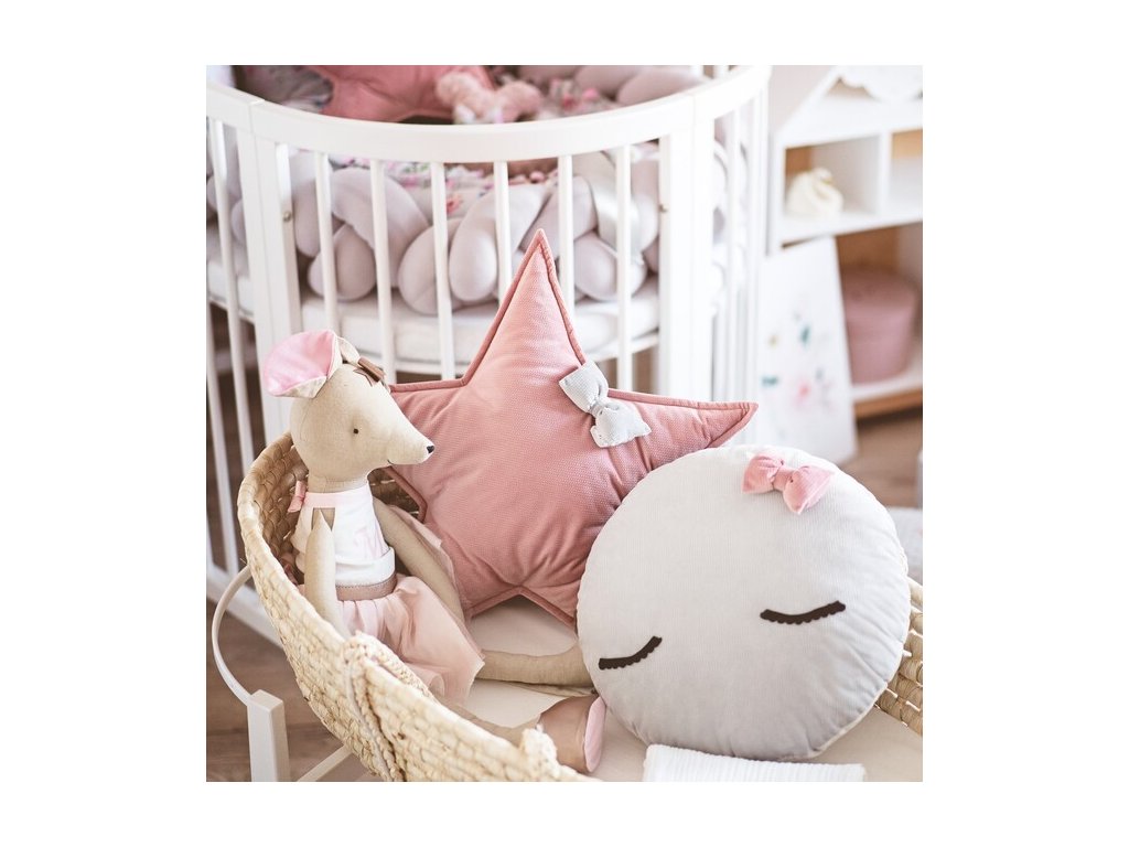 Vankúš v tvare splnu je svojim prevedením do detskej postieľky ako stvorený. Jeho chutné očká a mašlička, nielen rozžiaria každému dieťatku očká, ale povzbudia ich fantáziu. Jeho neodmysliteľnou súčasťou je aj kvalitný materiál, luxusný velvet, ktorý zaručuje pohodlie vášho dieťatka. Mašlička na vankúšiku podčiarkuje jeho roztomilosť a je takisto z velvetu. Ak si však mašličku prajete z iného materiálu, ako je velvet, môžeme vám ponúknuť prevedenie z bavlny, alebo mušelínu. Napíšte nám, prosíme, materiál a farbu do poznámky k objednávke – pomôže vám pri tom náš vzorkovník.