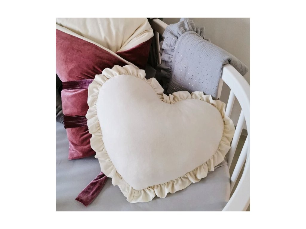 Vankúš Srdce je skvelá voľba, pretože svojim tvarom zaujme dieťatko už od útleho veku. Povrch vankúša je 100% bavlna a jeho okraje tvoria nádherné volány. Vankúš viete doladiť k ďalším textíliám, ako sú plachty, baldachýn, či nebesá.