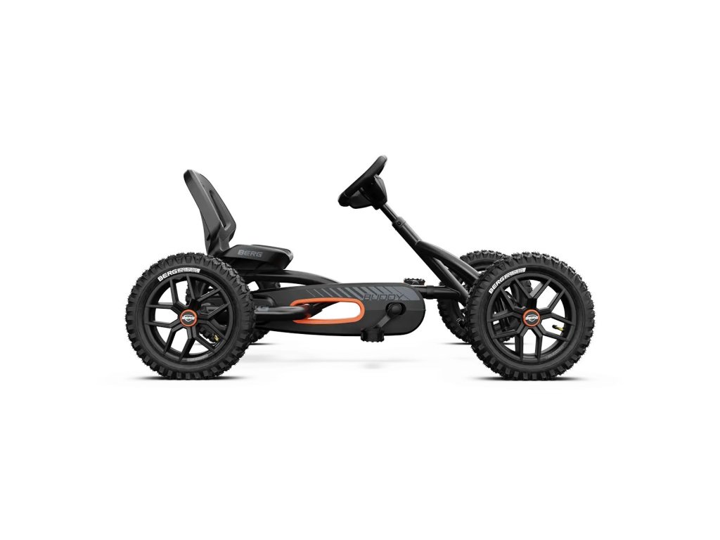 BERG Buddy je vyrobená z pevnej ocele, stabilitu v teréne zaručuje výkyvná náprava, tichý chod zaisťujú guličkové ložiská.