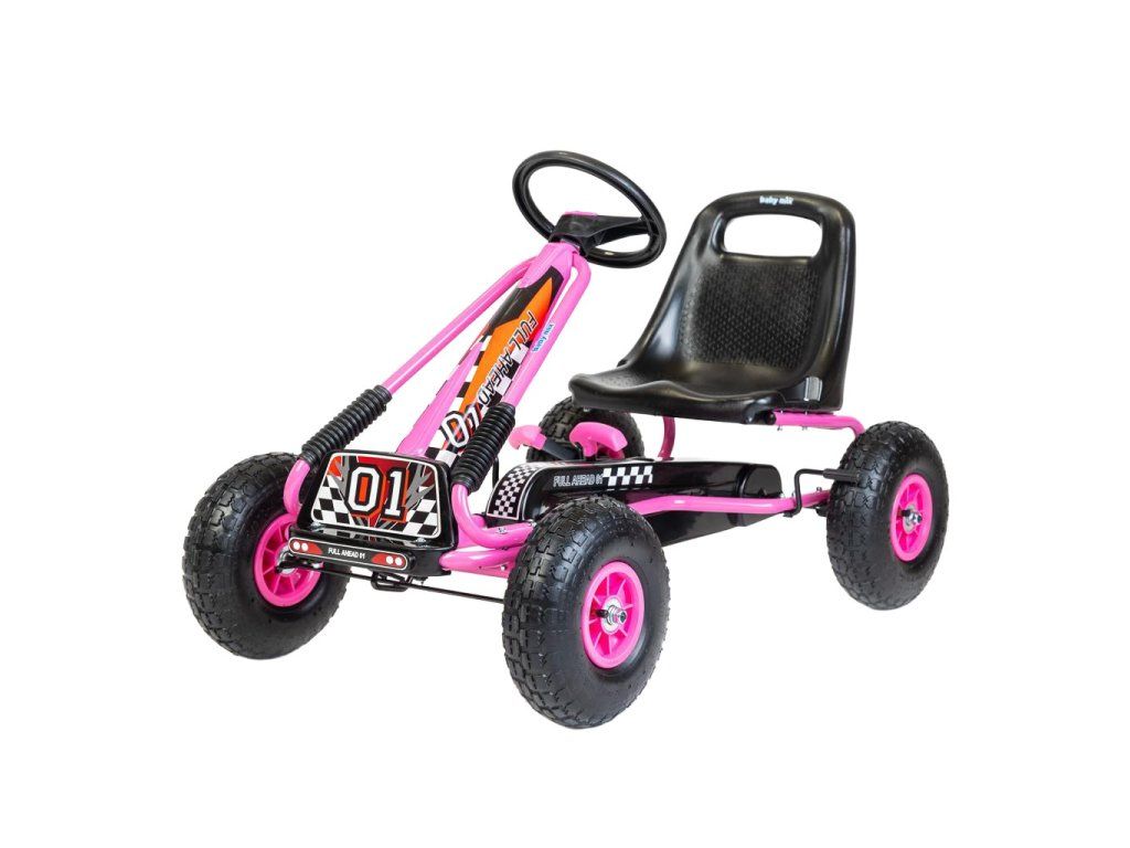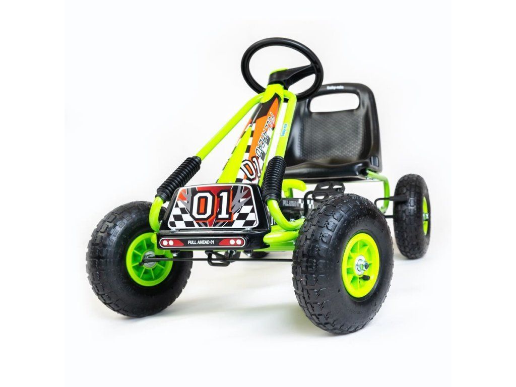 Veľké nafukovacie pneumatiky zaistia komfort a pohodlie pri jazde na akomkoľvek povrchu. Motokára má zabudovaný reťazový pohon s možnosťou odpojenia pohonu - funkcia voľnobežky a ručnú brzdu na zadnej náprave.