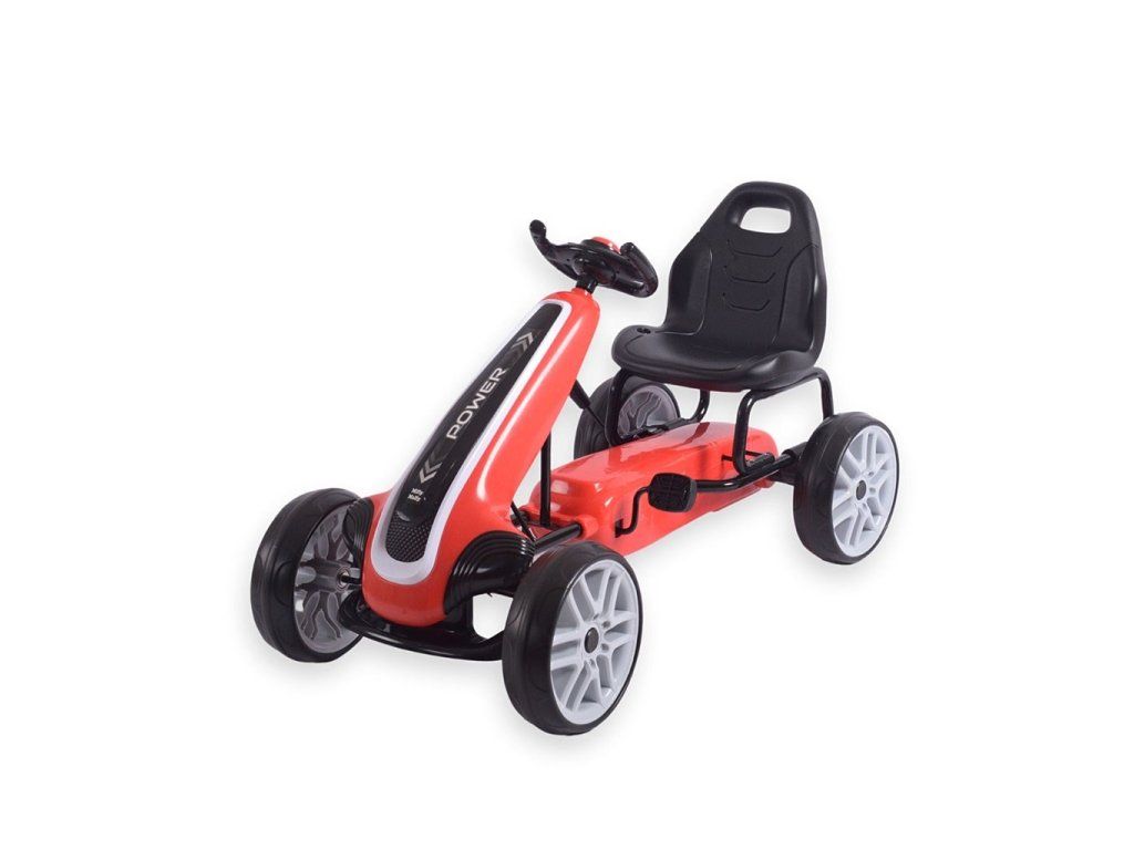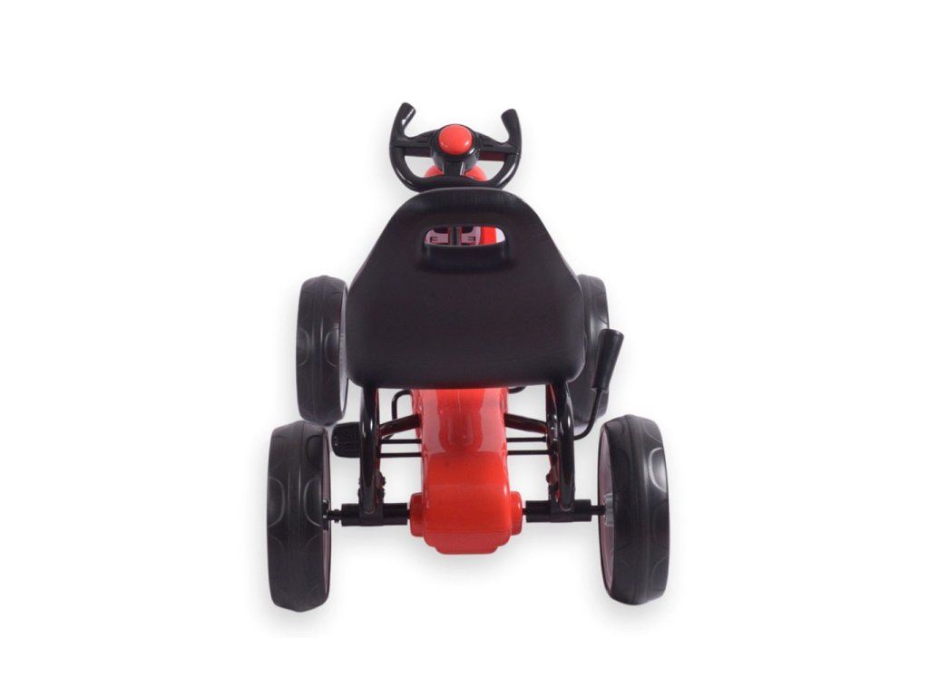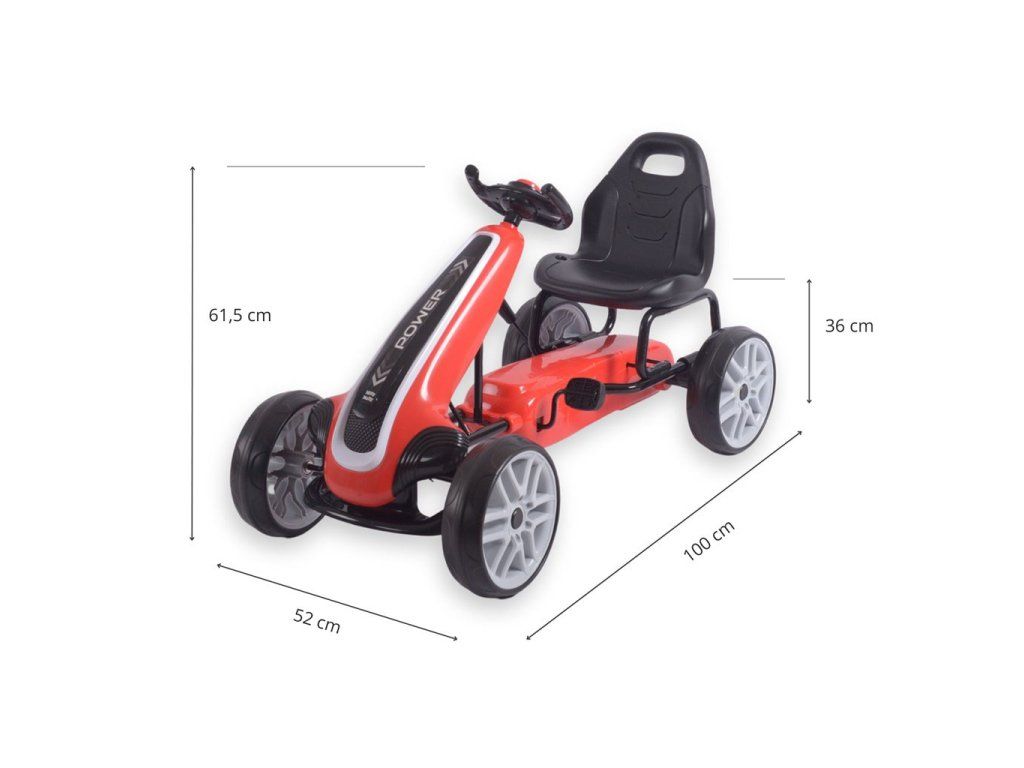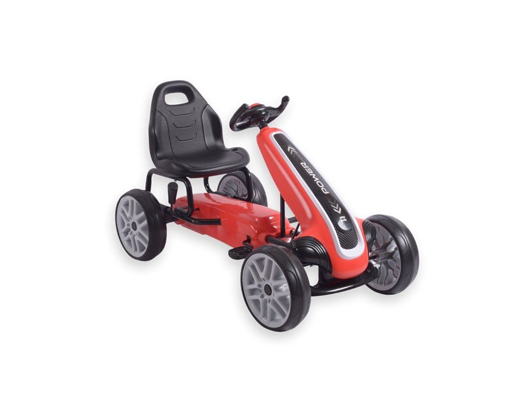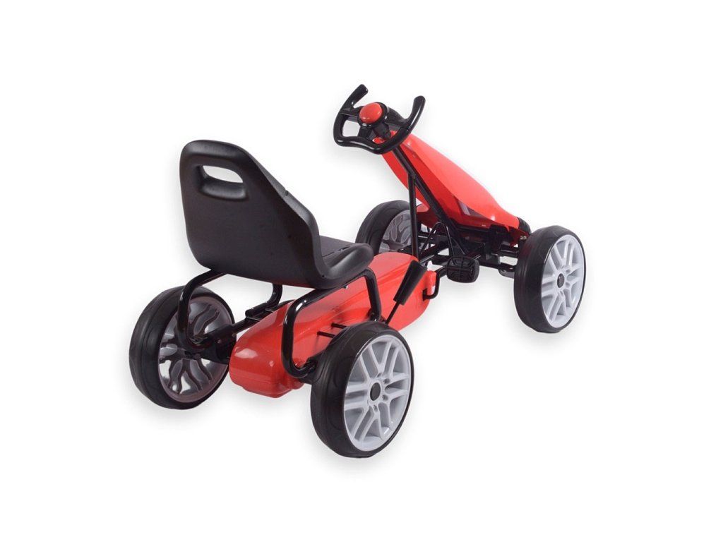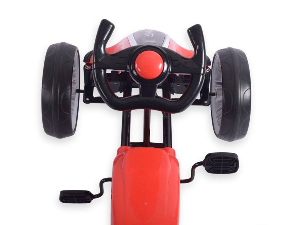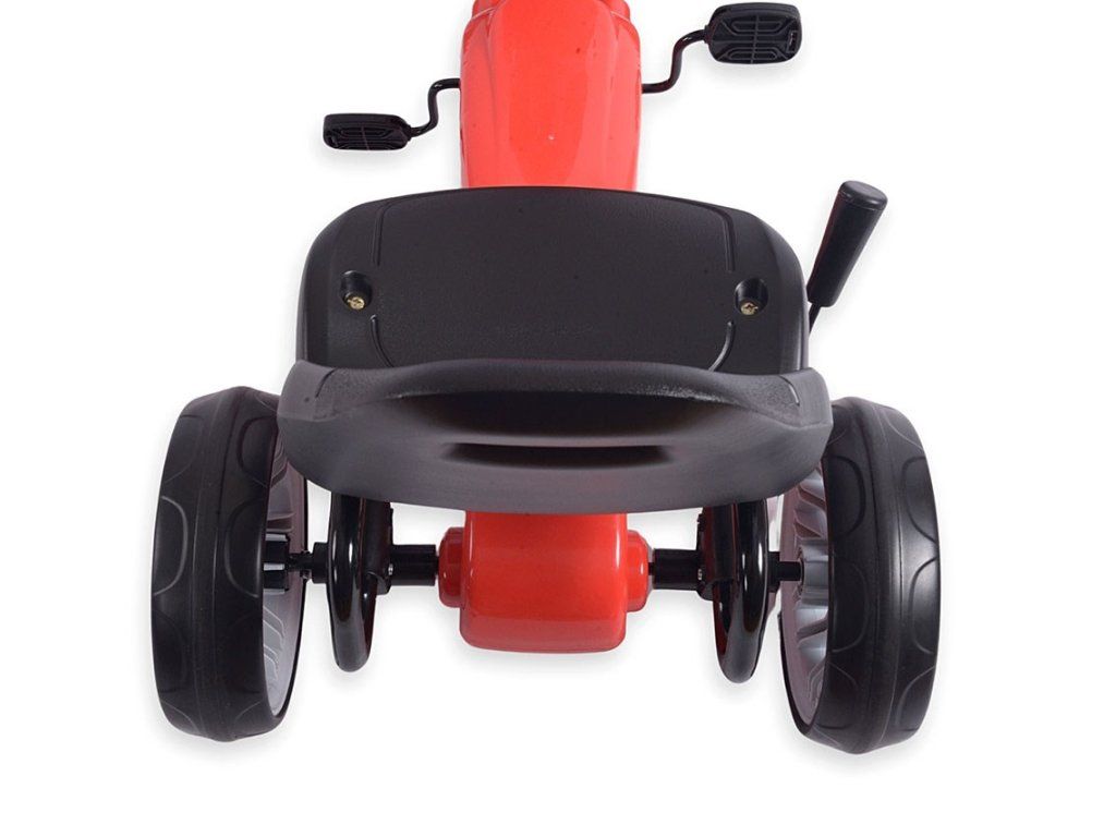 Vozidlo je vyrobené z ľahkej kovovej konštrukcie a vysokokvalitných plastov, ktoré zabezpečujú trvanlivosť a odolnosť proti poškodeniu. Má zabudovaný reťazový pohon s pedálmi a veľké, odolné kolesá s penovými pneumatikami (EVA) pre dobrú priľnavosť a pohodlie na rôznych povrchoch. Ergonomické športové riadidlá umožňujú pevné uchopenie a ľahké riadenie, zatiaľ čo tvarované sedadlo poskytuje pohodlnú jazdu. Je tiež vybavený ručnou záchrannou brzdou.