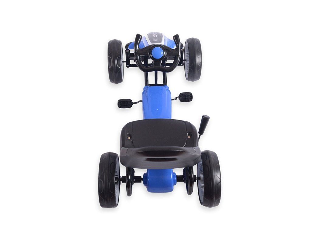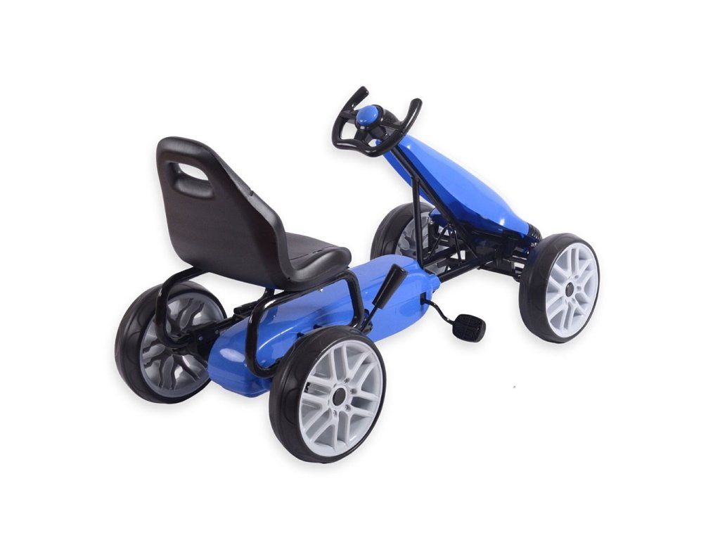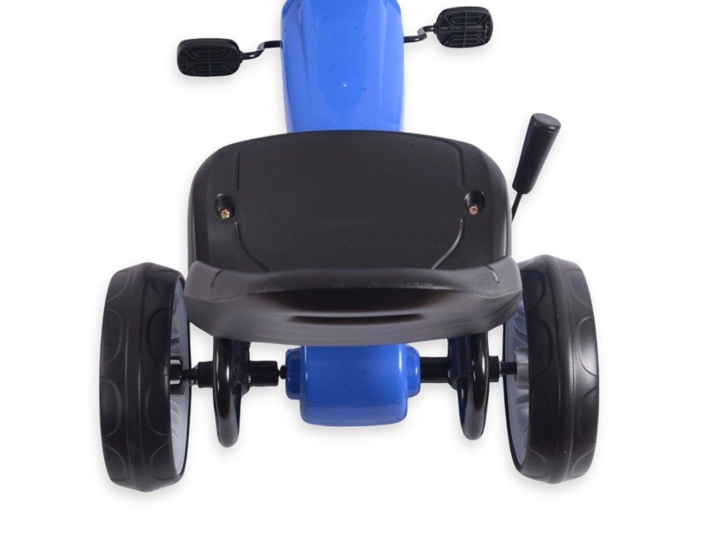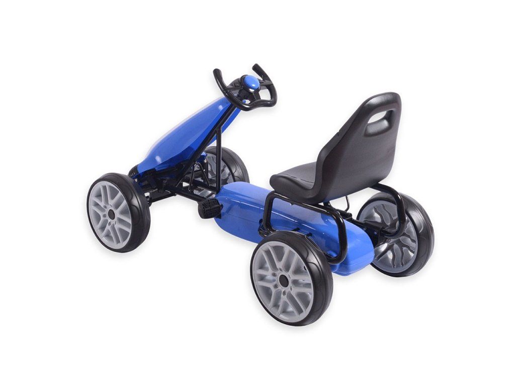 Vozidlo je vyrobené z ľahkej kovovej konštrukcie a vysokokvalitných plastov, ktoré zabezpečujú trvanlivosť a odolnosť proti poškodeniu. Má zabudovaný reťazový pohon s pedálmi a veľké, odolné kolesá s penovými pneumatikami (EVA) pre dobrú priľnavosť a pohodlie na rôznych povrchoch. Ergonomické športové riadidlá umožňujú pevné uchopenie a ľahké riadenie, zatiaľ čo tvarované sedadlo poskytuje pohodlnú jazdu. Je tiež vybavený ručnou záchrannou brzdou.