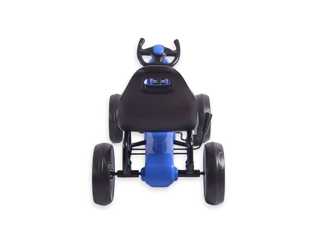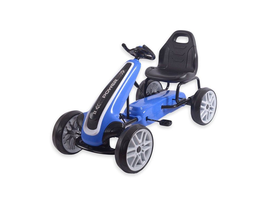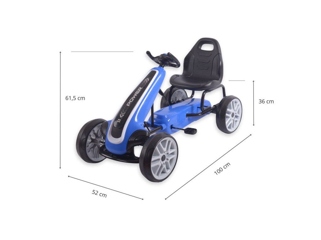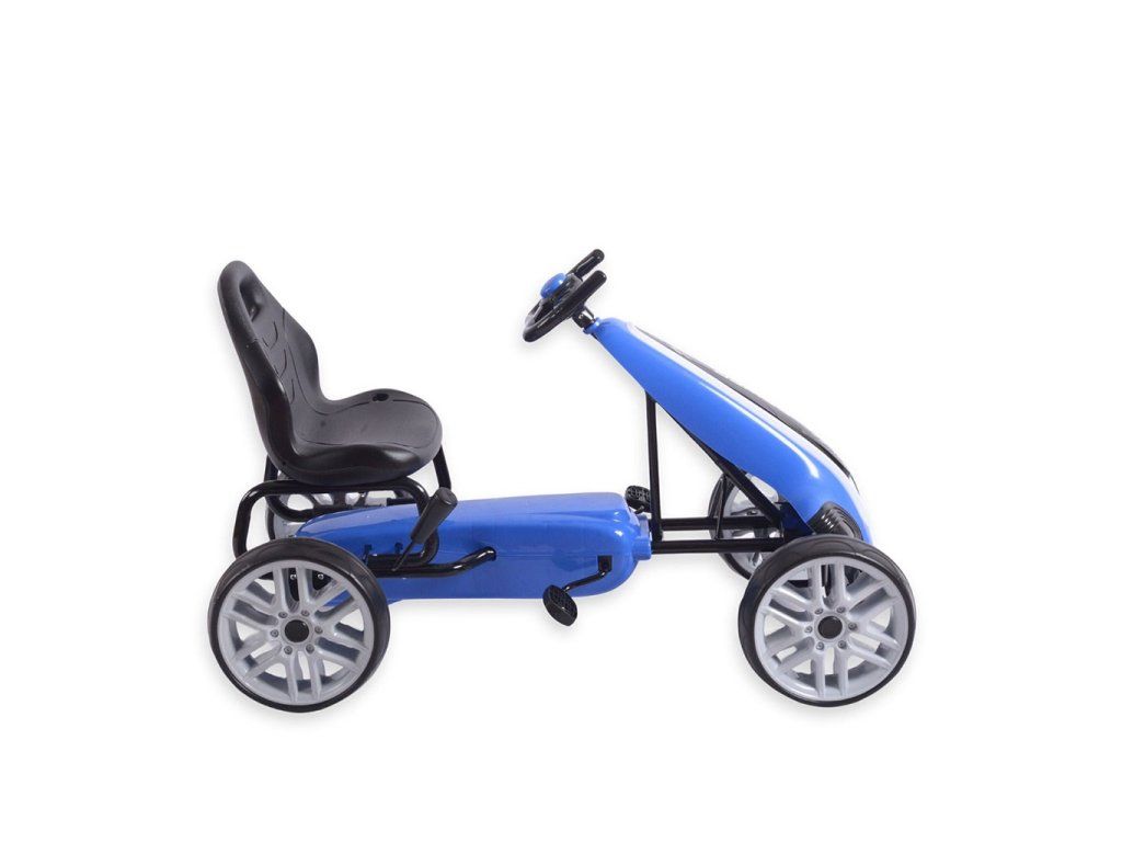 Vozidlo je vyrobené z ľahkej kovovej konštrukcie a vysokokvalitných plastov, ktoré zabezpečujú trvanlivosť a odolnosť proti poškodeniu. Má zabudovaný reťazový pohon s pedálmi a veľké, odolné kolesá s penovými pneumatikami (EVA) pre dobrú priľnavosť a pohodlie na rôznych povrchoch. Ergonomické športové riadidlá umožňujú pevné uchopenie a ľahké riadenie, zatiaľ čo tvarované sedadlo poskytuje pohodlnú jazdu. Je tiež vybavený ručnou záchrannou brzdou.