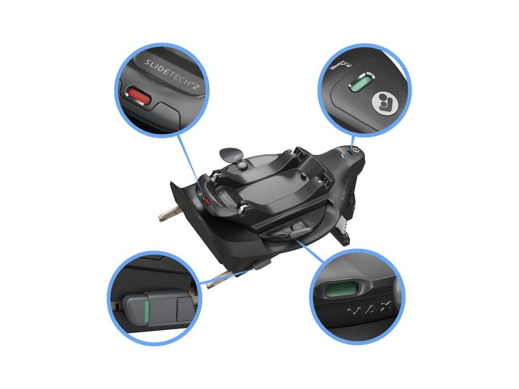 Základňa FamilyFix Slide Pro sa pripevňuje do auta s pomocou úchytov ISOFIX. Vizuálny indikátor na základni minimalizuje pravdepodobnosť nesprávneho pripevnenia autosedačky. Autosedačka sa na základňu pripevní ľahko a rýchlo prostredníctvom technológie Click-and-Go. Otočný systém základne umožňuje autosedačku jednou rukou otočiť pre jednoduchšie usadenie a pripútanie dieťaťa. Vďaka technológii FlexiSpin je možné autosedačku otáčať o 360 ° v akejkoľvek polohe autosedačky. Bezpečnostný zámok rotácie vám poskytuje istotu, že autosedačka s dieťaťom bude v idúcom aute vždy v správnej polohe pre jeho maximálne bezpečie.Ergonomické uvoľňovacie tlačidlo umožňuje jednoduché odpojenie autosedačky.
