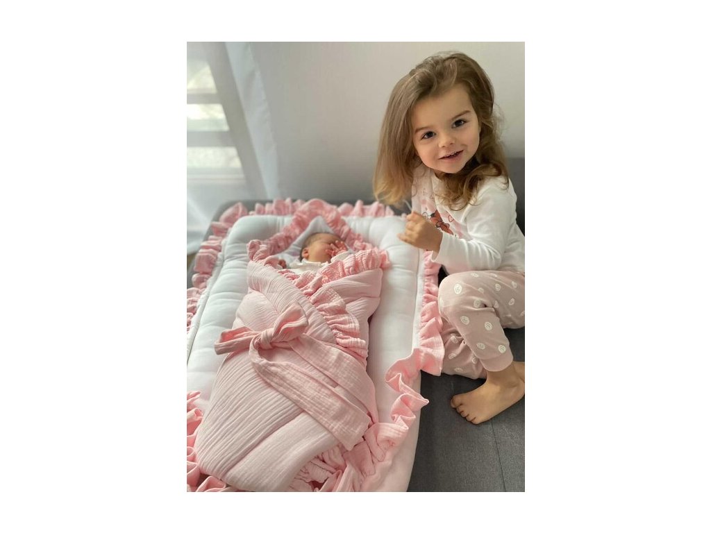 Obojstranná mušelínová zavinovačka s volánom o rozmere 78 × 78 cm upokojí vaše dieťatko a navodí mu pocit bezpečia a istoty.