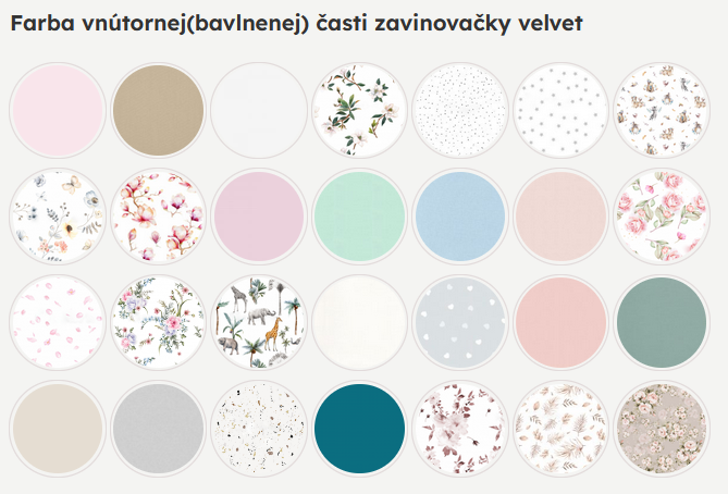 Farbu vnútornej(bavlnenej) časti zavinovačky uveďte do poznámky v objednávke. Na výber máte z týchto farieb: