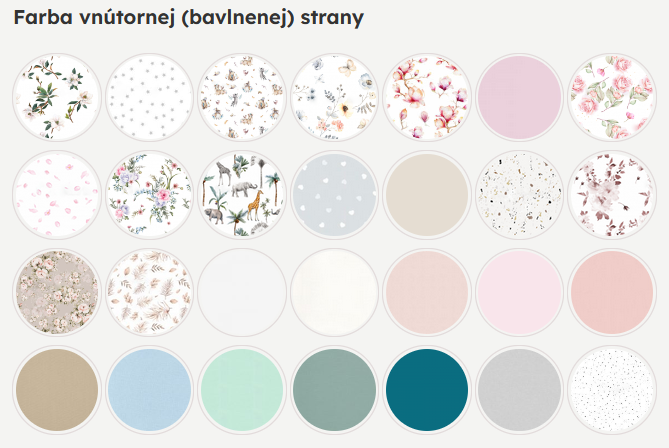 Farbu vnútornej (bavlnenej) strany zavinovačky uveďte do poznámky v objednávke. Na výber máte z týchto farieb: