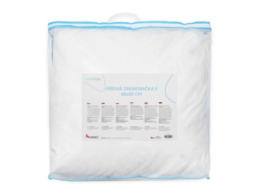 Luxusná páperová zavinovačka 80x80 cm New Baby. Táto luxusná páperová zavinovačka je synonymom pohodlia pri spánku. Zavinovačka poskytuje bábätku mäkký, teplý a bezpečný pocit podobný prostrediu v maminom brušku, čo pomáha dieťaťu prispôsobiť sa novým podmienkam. Vďaka vynikajúcim vlastnostiam peria zaisťuje zavinovačka stabilnú teplotu. Perie absorbuje vlhkosť a odvádza ju od tela počas spánku. Použité je špeciálne čistené a testované perie. Naše zavinovačky obsahujú 80 % draného husacieho peria a 20 % páperia (0,3 kg). Dodávame v praktickej taške na zips, ktorú môžete využiť aj na uskladnenie rôznych vecí doma.