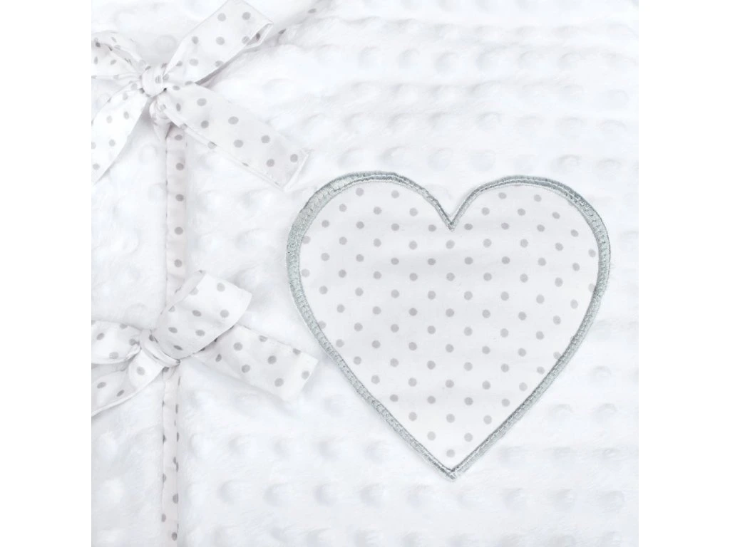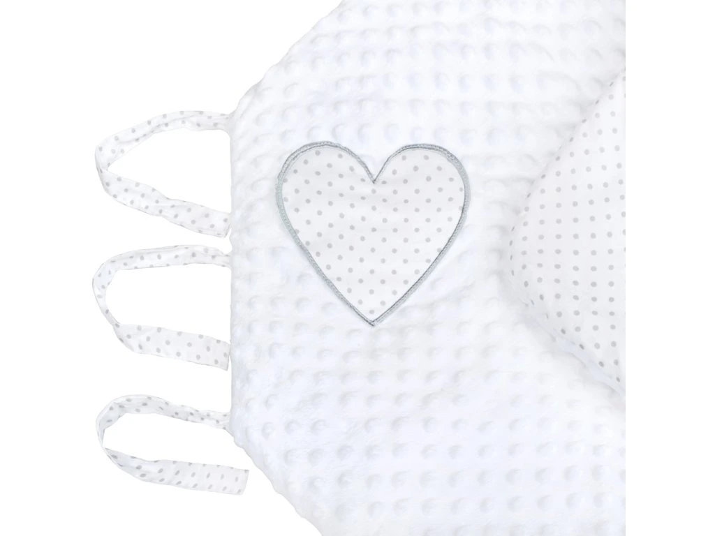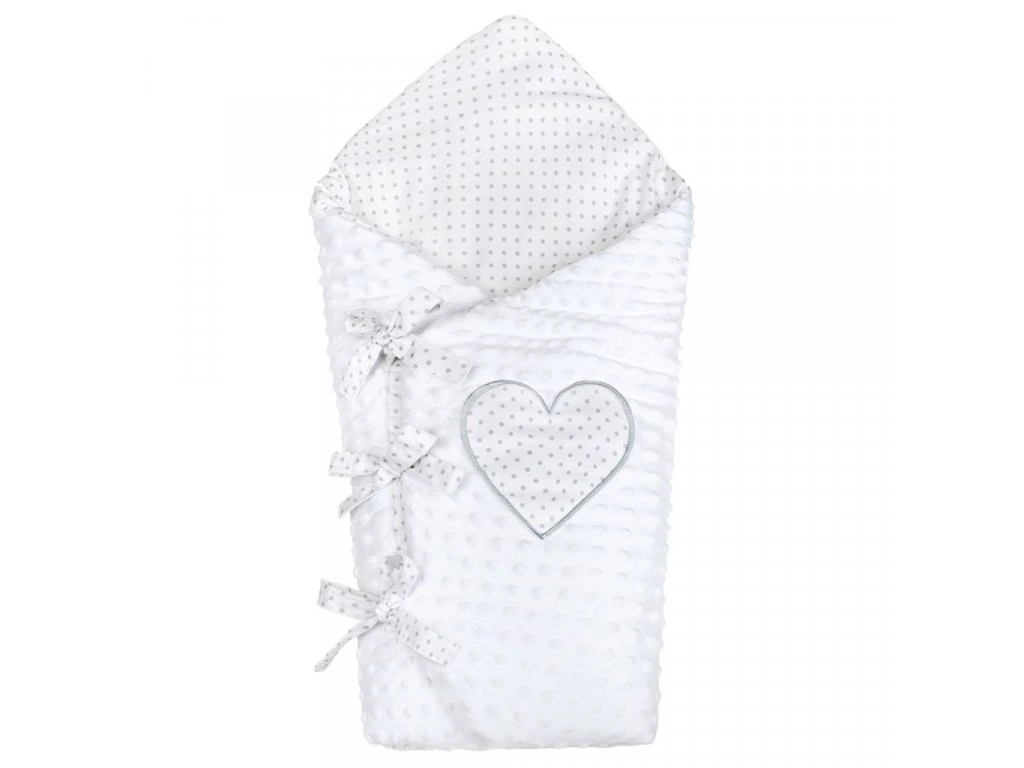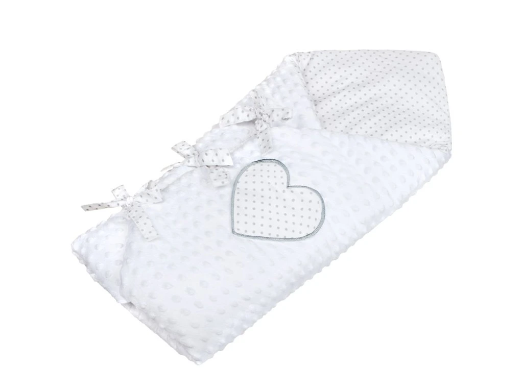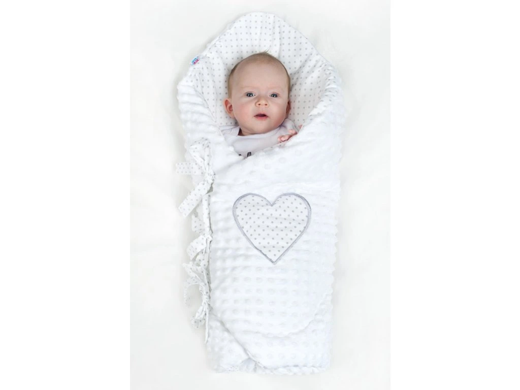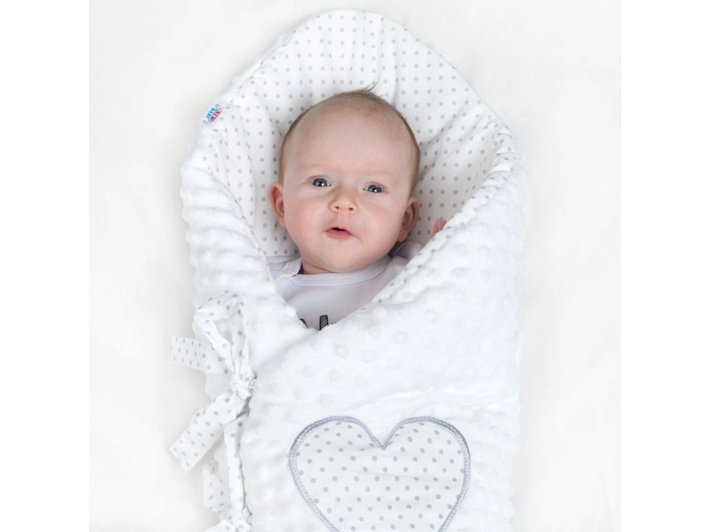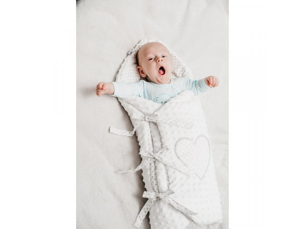 Luxusná šnurovacia zavinovačka z Minky New Baby. Zavinovačka je vyrobená z dvoch typov tkanín a je zdobená krásnym vyšívaným srdiečkom a sivým bodkovaným bavlneným podkladom. Prvá je veľmi mäkká a na dotyk príjemná, hebká Minky látka s výstupkami pre stimuláciu senzomotoriky a druhou je 100% bavlna. Zavinovačka sa zaväzuje na tri rady stúh, ktoré Vaše bábätko pevne zavinú.