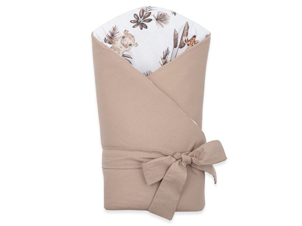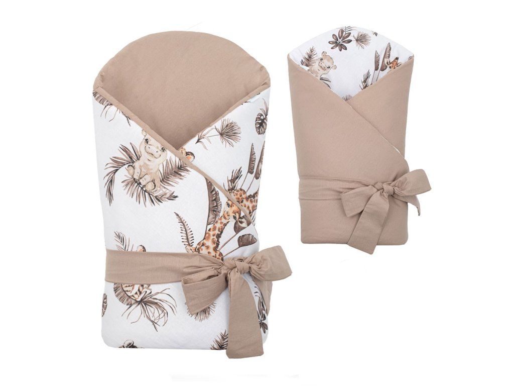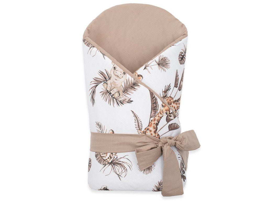 Nádherná detská obojstranná zavinovačka New Baby Safari pre bábätká. Zavinovačka je vyrobená z kvalitného a jemného materiálu, ktorý zaručí vášmu bábätku príjemné teplo. Výplň je až 3 cm čo znamená, že zavinovačka je vhodná aj na chladnejšie dni a je dostatočne pevná. Krásny detský motív, polahodí detským očičkám. Zapínanie na suchý zips aj stuhu na zaviazanie na mašľu.Rozmery cca 80x80cm.