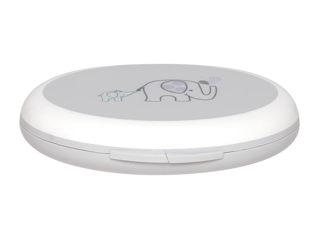Obsahuje nožnice so zaoblenými koncami, pilník na nechty a tiež klieštiky na nechty. Všetko je vyrobené z nehrdzavejúcej ušľachtilej ocele. Krabička s výrazným motívom na viečku chráni pred prachom a pomáha udržiavať manikúru v čistote. Ale aj napriek tomu pred každým použitím jednotlivé nástroje dôkladne očistite a u novorodencov aj dezinfikujte roztokom liehu.