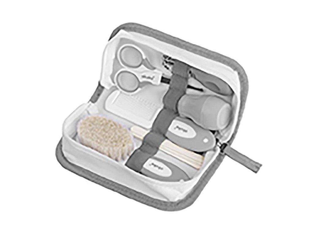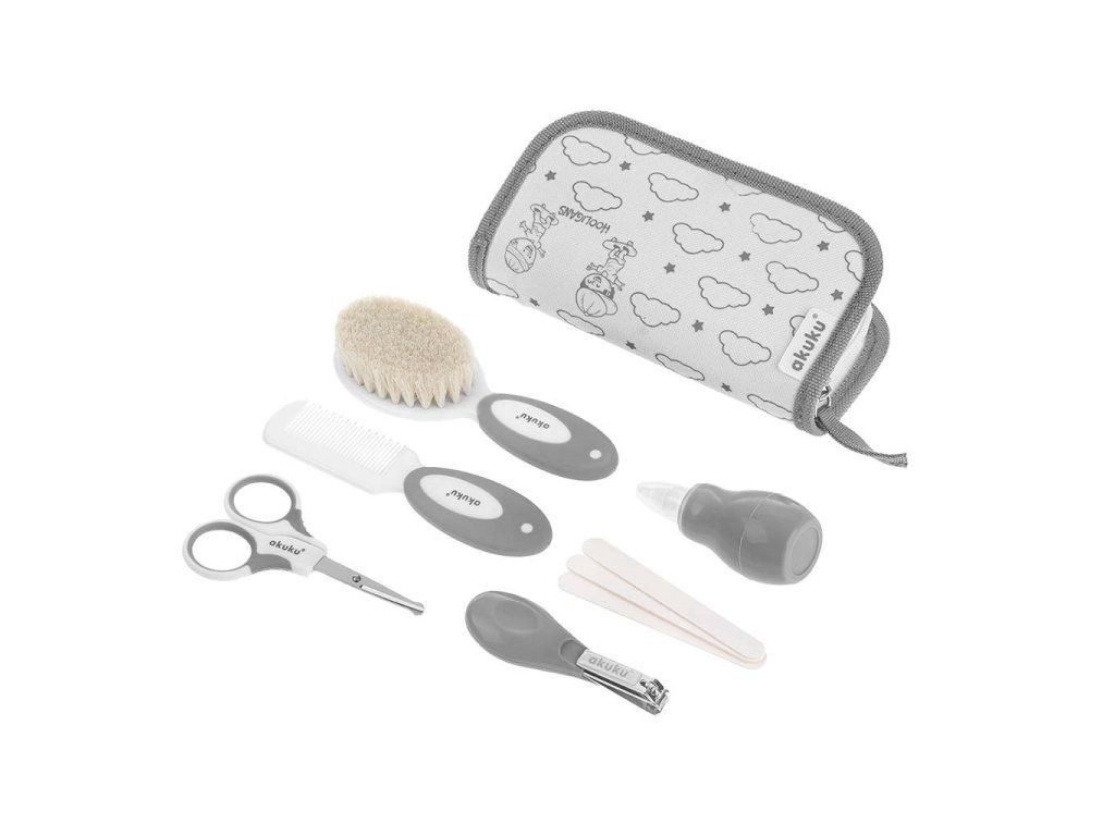 Nožnice (s tenkými kovovými čepeľami a zaoblenými hranami) a klieštiky na nechty pomáhajú bezpečne a spoľahlivo strihať nechty a pilník na nechty ľahko odstráni nerovnosti a chráni dieťa pred poškriabaním. O hlavičku vášho dieťaťa sa postará kefka s mäkkými prírodnými štetinami a hrebeň s protišmykovou rukoväťou. Nosová odsávačka s mäkkou špičkou je navrhnutá tak, aby uvoľnila dýchacie cesty a maz z uší dieťaťa.