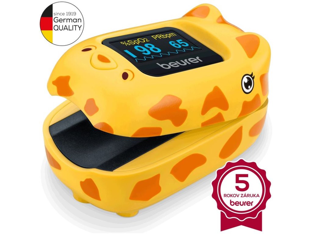 Detský pulzný oxymeter BEURER PO13 Kids je ideálny pre deti a bábätká vďaka rýchlemu, úplne bezbolestnému meraniu a prispôsobeniu tvaru malým prstom.Merajte saturáciu kyslíkom a pulz hravou formou vďaka roztomilému žirafiemu dizajnu. Pulzný oxymeter PO13 Kids od Beureru je svojim malým dizajnom a meraním behom niekoľkých sekúnd prispôsobený veľkosti a trpezlivosti detí a bábätiek. Výsledky sa spoľahlivo a v priebehu niekoľkých sekúnd objavia na farebnom displeji, ktorý má automatické otáčanie a 4 voliteľné formáty zobrazenia.Charakteristika a technické údaje: Meranie saturácie kyslíkom (SpO2) a srdcovej frekvencie (pulz) Jednoduché a úplne bezbolestné meranie do 8 sekúnd Malý a ľahký – na použitie doma aj na cestách Zobrazte merania v priebehu niekoľkých sekúnd bez testovania trpezlivosti detí Prispôsobené veľkosti detských prstov Vhodné pre deti s ochoreniami ako sú: - Ochorenia srdca - Chronická obštrukčná choroba pľúc - Bronchiálna astma - Spánkové apnoe Ľahko čitateľný farebný displej so 4 formátmi zobrazenia Nastaviteľný jas displeja Displej sa orientuje automaticky (vertikálny formát, horizontálny formát) Grafické zobrazenie pulzu Ovládanie jedným tlačidlom Indikátor slabej batérie Automatické vypnutie šetriace batériu Fixačný pás a puzdro na opasok súčasťou balenia Napájanie: 2 x AAA batérie v balení Veľkosť displeja: 2,2 cm x 1,1 cm Technológia zobrazenia: TFT Trieda ochrany IP: IP22 Rozmery produktu: 59 x 37 x 35 mm Hmotnosť produktu: cca. 73 g (bez batérií) Zdravotnícka pomôcka podľa nového nariadenia o zdravotníckych pomôckach (EÚ) 2017/745 (MDR) Záruka: 5 rokovKolekcia starostlivosti o dieťa nemeckého špecialistu Beurer obsahuje starostlivo prispôsobenú škálu produktov, ktoré spĺňajú všetky potreby detí a rodičov: od detských monitorov, klinických teplomerov, detských váh a odsávačiek mlieka až po ohrievače, sterilizátory fliaš, inhalátory či pulzné oxymetre. Starostlivosť o dieťa Beurerom, to je len to najlepšie pre našich malých!Dodatočné parametre