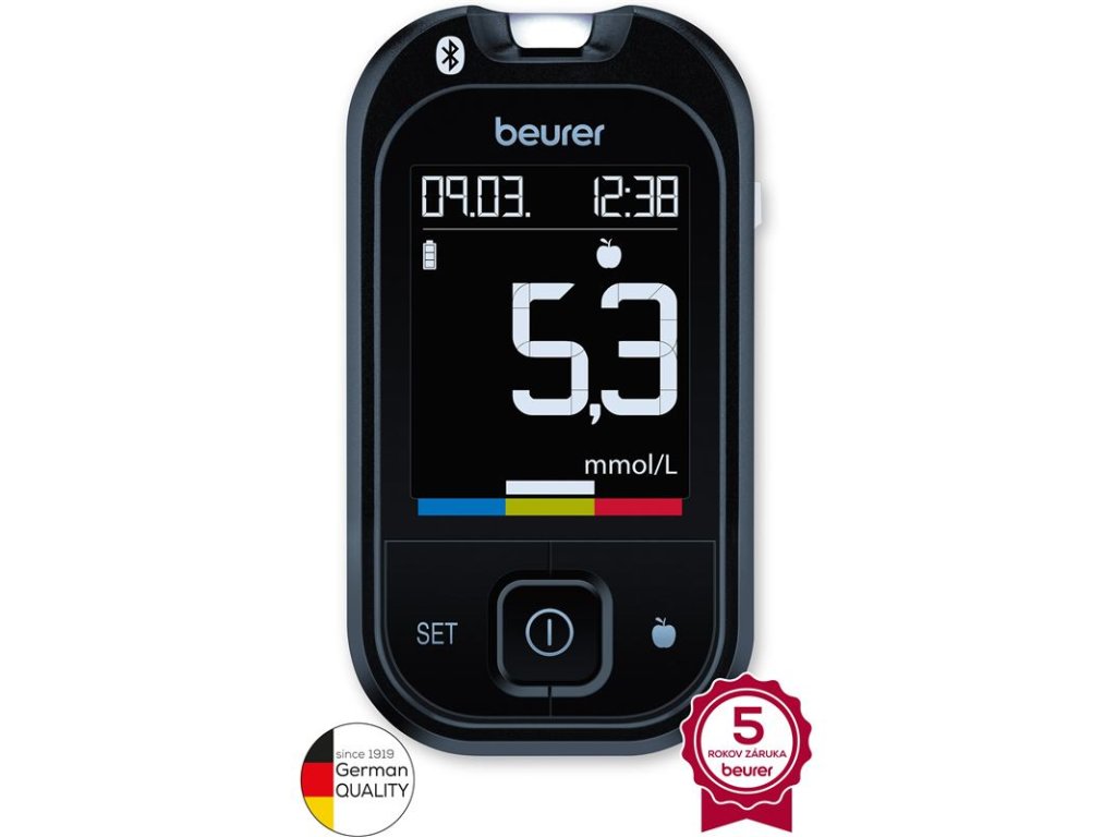 Glukomer BEURER GL49 mmol/L zabezpečuje rýchle a jednoduché meranie hladinu cukru v krvi: farebná indikácia a displej vám pomôžu bez námahy interpretovať meranie. Po pripojení cez Bluetooth si pomocou bezplatného softvéru „beurer HealthManager Pro“ môžete zaznamenať svoje merania do elektronického denníka. Glukomer BEURER GL49 – Rýchlo, intuitívne a presne.Charakteristika a technické špecifikácie: Jednoduché použitie: praktické testovacie prúžky, jednoduché označenie nameranej hodnoty pre optimalizovaný manažment cukrovky: pred jedlom, po jedle, všeobecné označenie Veľký, podsvietený displej s prehľadným užívateľským menu Osvetlený vkladací slot Kontrola objemu krvi: meranie je možné len s dostatočnou vzorkou krvi Komplexná štartovacia sada: merací prístroj GL 49, odberové pero LD 04, 10 lanciet, 10 testovacích prúžkov, USB kábel, puzdro, návod na použitie, stručný návod, glykemický denník Upozornenie na ketón na displeji Softvér GlucoMemory v nemčine a angličtine: Jednoduchý prehľad výsledkov a trendov v cieľovom koridore Potrebné množstvo krvi: 0,5 mikrolitrov Čas merania: cca 5 sekúnd Pamäť na 900 meraní s dátumom, časom a nameranou hodnotou Výpočet priemernej hodnoty za 7, 14, 30 alebo 90 dní Vzorka krvi: čerstvá plná krv (kapilárna) alebo venózna plná krv Plazmovo kalibrované Rozsah merania: 1,1 - 35,0 mmol/L Prípustný hematokrit: 20 – 60 % Plne vyhovuje EN ISO 15197:2015 Prenos údajov do „beurer HealthManager Pro“ Automatické vypnutie Jednotka merania glukózy v krvi: mmol/l Klinicky testované Veľký, dobre čitateľný displej Prenos cez Bluetooth Kompatibilné s iOS 14.0 a Android 8.0 alebo vyšším a s Bluetooth 4.0 alebo vyšším Funkcia vysúvania prúžkov pre hygienickú likvidáciu Napájanie: 2 gombíkové batérie, 3 V CR2032 (už vložené) Hmotnosť produktu: 52 g Rozmery produktu: 95 x 53 x 15 mm Zdravotnícka pomôcka Záruka: 5 rokovPravidelná kontrola a meranie hladiny cukru v krvi je nevyhnutnou súčasťou liečby cukrovky. Moderné glukomery Beurer pomáhajú okamžite rozpoznať a reagovať na vysokú hladinu glukózy v krvi a hypoglykémiu.Glukomery od nemeckej spoločnosti Beurer - Jedinečná jednoduchosť použitia, aktuálny dizajn a prvotriedna kvalita.Skenovať a uložiť - pomocou funkcie Scan and Save v aplikácii beurer HealthManager Pro môžete jednoducho skenovať namerané hodnoty glukomeru Beurer a dokonca ich v aplikácii uložiť aj bez Bluetooth.Dodatočné parametre