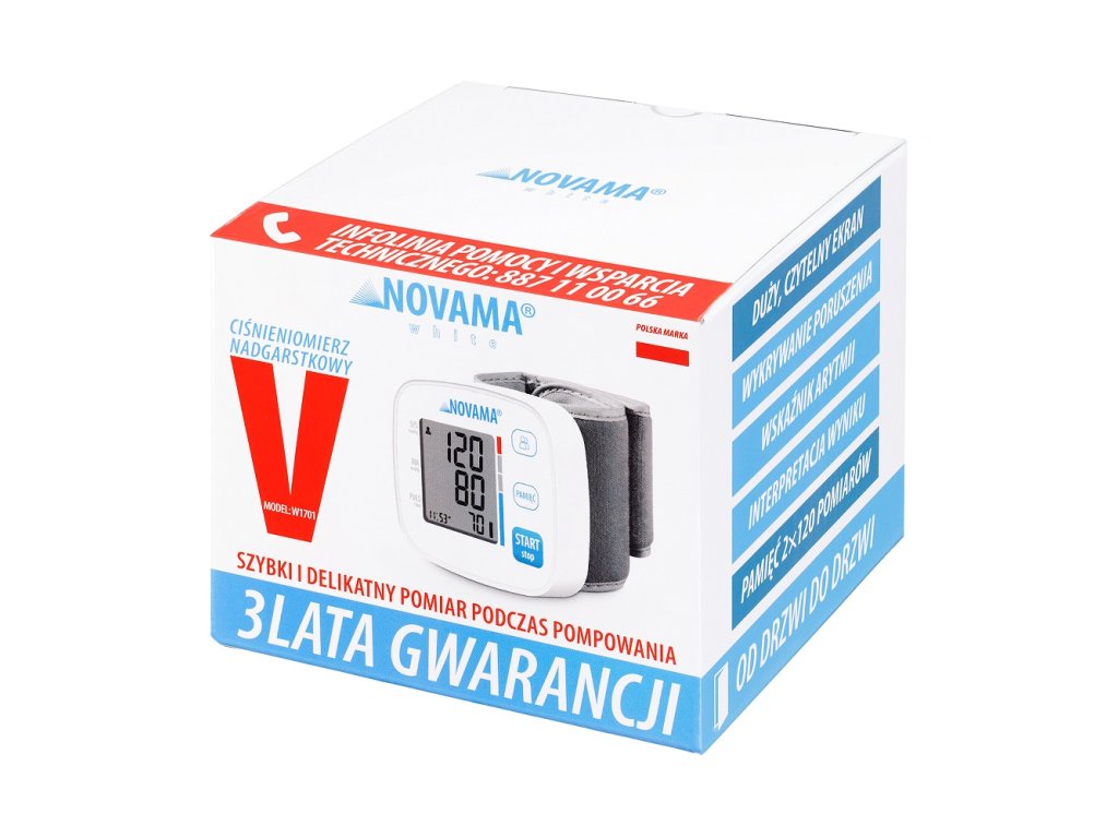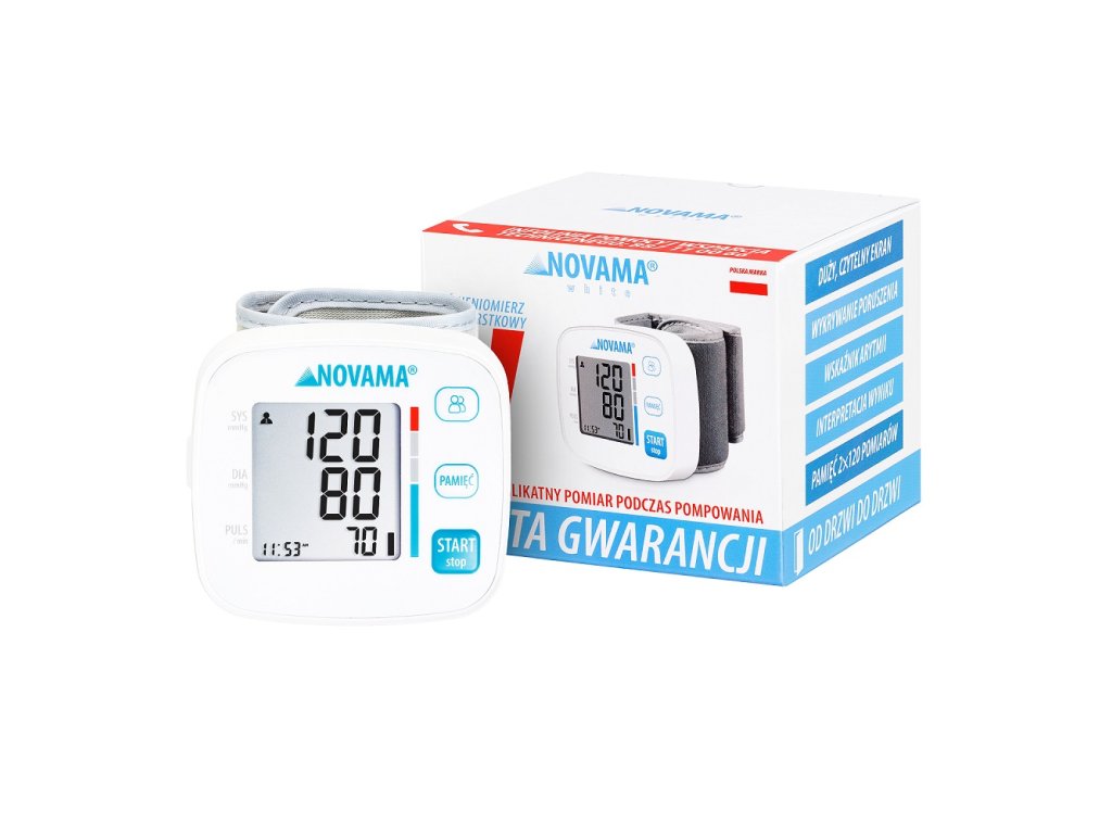 NOVAMA WHITE V je zápästný tlakomer novej generácie, ktorý ponúka funkcie a vlastnosti predstihujúce štandardy pri zachovaní prívetivej ceny - takže výber tlakomeru zostáva jednoduchý. Tento model je vybavený najnovšími technológiami, ktoré skracujú čas merania a eliminujú chyby, ako je meranie pri nafukovaní a detekcia pohybu počas merania.
