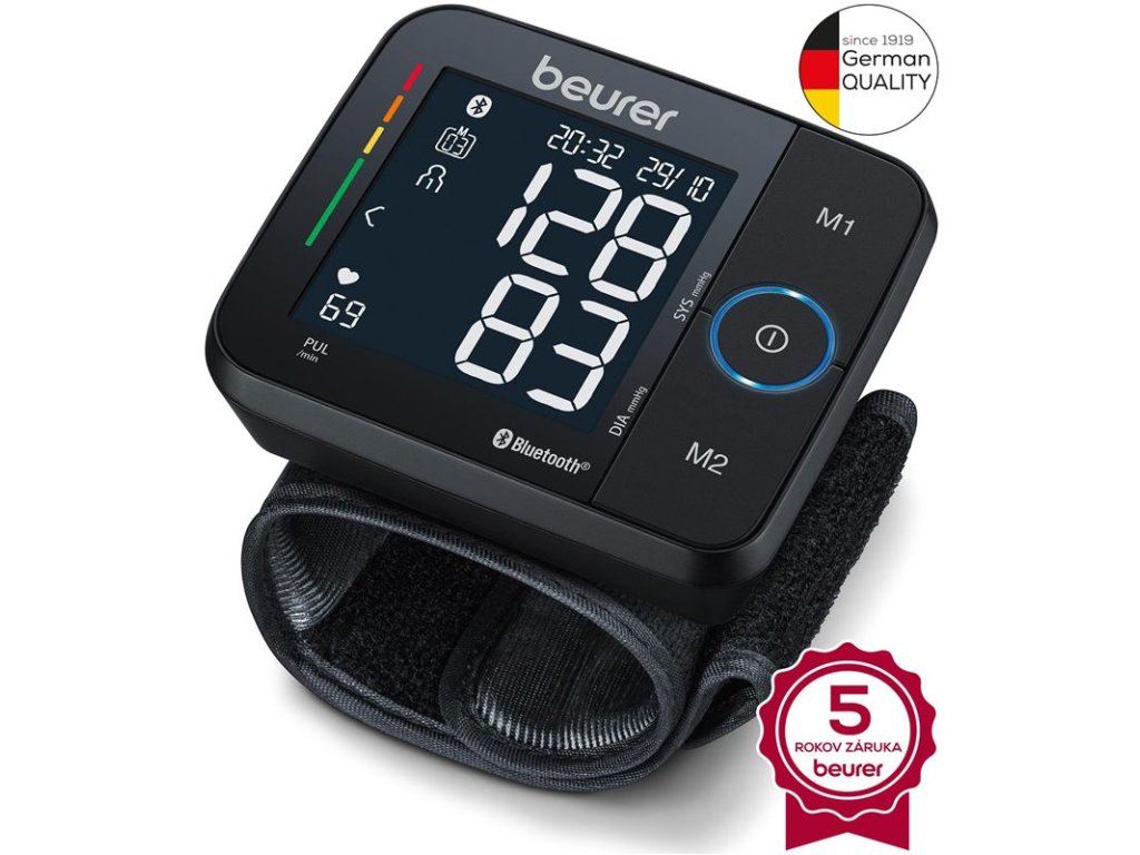 Plne automatický zápästný tlakomer BEURER BC54 meria rýchlo a pohodlne už aj počas nafukovania. Prenos údajov cez Bluetooth priamo do smartfónu zaisťuje, že si môžete kedykoľvek pozrieť namerané hodnoty.Charakteristika a technické údaje:Inflačná technológia: meranie sa vykonáva už počas nafukovania manžetyUkazovateľ rizika: klasifikácia meraní s farebnou stupnicouJasný, ľahko čitateľný čierny displejBezdrôtový prenos meraníPriemer všetkých uložených nameraných hodnôt2 užívateľské pamäte, každá pre 60 nameraných hodnôtDetekcia arytmiePre obvody zápästia od 13,5 do 21,5 cmDátum a časAutomatické vypnutieSignalizácia nesprávneho použitiaSoftvér a aplikácia „beurer HealthManager“ je k dispozícii na stiahnutie zadarmoKompatibilné s iOS 10.0 a Android 5.0 alebo vyšším a Bluetooth 4.0 alebo vyššímNapájanie: 2 x 1,5 V AAA batérie (v balení)Skladovacie puzdroIndikátor slabej batérieRozmery zariadenia: 80,5 x 69,5 x 25 mmHmotnosť: cca. 116 g (bez batérií, s manžetou)Zdravotnícka pomôckaCE: ánoMonitory krvného tlaku od nemeckej značky Beurer sú presné, pohodlné a ľahko sa používajú. Vďaka nim môžete sledovať vývoj svojho krvného tlaku doma, v práci alebo na cestách, a tým pomáhajú udržiavať Vaše zdravie a dlhodobý blahobyt! Ľahko sa používajú, stačí nasadiť na zápästie a spustiť meranie. Vďaka tlakomerom Beurer si ľudia nielen sledujú svoj krvný tlak, ale uvedomia si aj dôležitosť zdravia a zdravého životného štýlu.Tlakomery Beurer sú schválenými zdravotníckymi pomôckami, ktoré sú v súlade s MDD 93/42/EEC a majú príslušnú značku CE ako zdravotnícke pomôcky.Beurer - Najpredávanejšia značka tlakomerov na nemeckom trhu a druhá najpredávanejšia značka tlakomerov na svete.Dodatočné parametre
