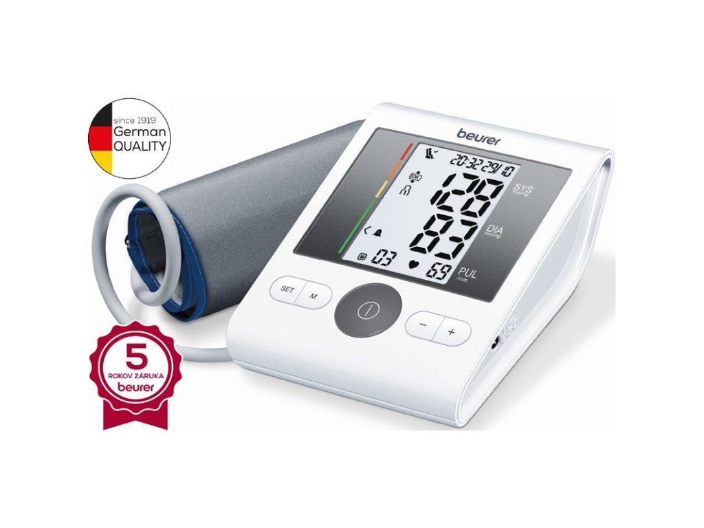 Plnoautomatický ramenný tlakomer od nemeckého výrobcu Beurer. Tento úžasný prístroj v sebe spája spoľahlivý monitor krvného tlaku a tepu.Tlakomer disponuje funkciou detekcie arytmie - chyby srdcového rytmu!Pre jednoduchú interpretáciu výsledkov merania tlaku tlakomer disponuje grafickou farebnou indikáciou (červené pole - vysoký alebo nízky tlak, zelené pole - normálny tlak)Charakteristika a technické údaje: v balení so sieťovým adaptérom plne automatické meranie krvného tlaku a pulzu na hornej časti paže ľahko čitateľný displej priemer zo všetkých meraní 4 x 30 pamäťových miest ukazovateľ rizika detekcia arytmie: varovanie v prípade možného narušenia srdcového rytmu manžeta nadlaktie obvodov 22 až 42 cm možné nastavenie alarmu 2 krát zdravotnícky prostriedok dátum a čas / automatické vypnutie indikátor výmeny batérie signál v prípade chyby aplikácie automatická predvoľba tlaku a deflácie Ramenné tlakomery Beurer sú uznané pre ich presnosť, jednoduchosť použitia a cenovú dostupnosť a poskytujú kvalitu za dostupnú cenu každému, kto potrebuje kvalitný monitor krvného tlaku pre domáce použitie. Tlakomery Beurer sú určené na meranie a monitorovanie arteriálneho krvného tlaku na ramene. Meranie je veľmi jednoduché, vhodné úplne pre každého, doma i na cestách. Tlakomery Beurer sú prispôsobené prísnym požiadavkám a špecifikáciám smernice MDD 93/42 / EEC o zdravotníckych pomôckach a majú príslušnú značku CE.Sortiment ramenných tlakomerov Beurer je široký a pokrýva zariadenia od plne automatických jednoduchých modelov s jedným pamäťovým kanálom až po najkomplexnejšie moderné modely s duálnymi pamäťovými kanálmi a dotykovou obrazovkou. Zo širokého sortimentu si vyberie naozaj každý, presne podľa požiadaviek a okolností. Ramenné tlakomery Beurer môžu použiť ľudia všetkých vekových kategórií a môžu byť tiež veľmi užitočné pri starostlivosti o starších v domovoch dôchodcov.Ramenné tlakomery Beurer boli testované na presnosť a spoľahlivosť a boli označené značkou CE o zdravotníckych pomôckach podľa smernice MDD 93/42 / EEC o zdravotníckych pomôckach. Sú tiež v súlade s európskymi normami pre neinvazívne prístroje na meranie krvného tlaku EN1060-1 a EN1060-3. Tlakomery Beurer sú uznávané za najvyššiu kvalitu a presnosť na globálnom trhu zdravotnej starostlivosti. To je skrátka Beurer - prináša spoľahlivosť, presnosť, pohodlie a jednoduchosť použitia za prijateľnú cenu.Beurer - Najpredávanejšia značka tlakomerov na nemeckom trhu a druhá najpredávanejšia značka tlakomerov na svete.Dodatočné parametre