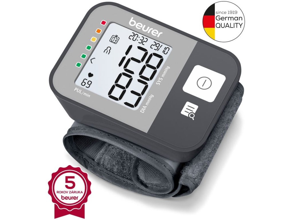 Zmerajte si krvný tlak jednoducho a plne automaticky. Zápästný tlakomer BEURER BC27 je vybavený farebnou stupnicou pre jednoduchú klasifikáciu vašich meraní. Prístroj detekuje a upozorňuje na možné srdcové arytmie prostredníctvom detekcie arytmie a tiež ponúka pamäť pre dve osoby až na 60 meraní. Majte svoje zdravie pod kontrolou!Charakteristika a technické údaje: Plne automatické meranie krvného tlaku a pulzu na zápästí S manžetou pre obvod zápästia od 14 - 19,5 cm Dve užívateľské pamäte pre 60 nameraných hodnôt Priemerná hodnota všetkých uložených meraní a ranného a večerného krvného tlaku za posledných 7 dní Detekcia arytmie: varuje pred možnými srdcovými arytmiami Indikátor rizika: klasifikácia meraní na farebnej škále Prehľadný, dobre čitateľný displej Dátum a čas Automatické vypnutie Signál v prípade chyby aplikácie Indikátor výmeny batérie Automatická predvoľba tlaku a vypúšťanie Vrátane 2 x 1,5 V AAA batérie a praktického úložného boxu Zdravotnícka pomôcka Rozmery produktu (DxŠxV): 84 x 60 x 29 mm Hmotnosť produktu: cca 92 g (bez batérií, s manžetou) CE: áno 5 ročná zárukaTlakomery od nemeckej značky Beurer sú presné, pohodlné a ľahko sa používajú. Vďaka nim môžete sledovať vývoj svojho krvného tlaku doma, v práci alebo na cestách, a tým pomáhajú udržiavať Vaše zdravie a dlhodobý blahobyt! Ľahko sa používajú, stačí nasadiť na zápästie a spustiť meranie. Vďaka tlakomerom od značky Beurer si ľudia nielen sledujú svoj krvný tlak, ale uvedomia si aj dôležitosť zdravia a zdravého životného štýlu!Tlakomery Beurer sú schválenými zdravotníckymi pomôckami, ktoré sú v súlade s MDD 93/42/EEC a majú príslušnú značku CE ako zdravotnícke pomôcky.Beurer - Najpredávanejšia značka tlakomerov na nemeckom trhu a druhá najpredávanejšia značka tlakomerov na svete.Dodatočné parametre