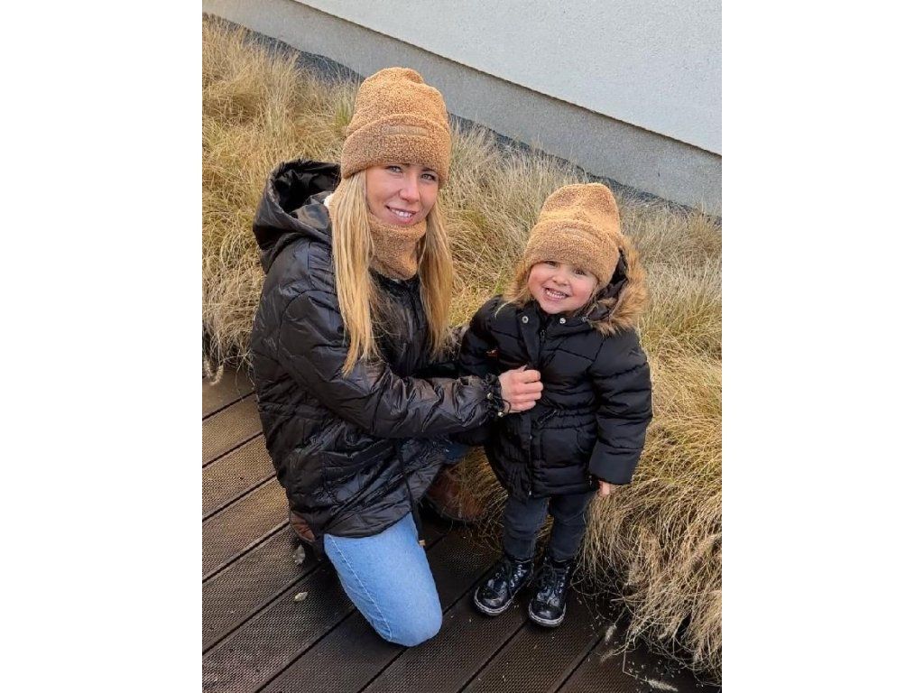 Výhodný set duo balenie čiapok pre mamičku/otecka a dieťa.Mäkučká čiapka z medvedíkového úpletu zdobená koženkovým štítkom.