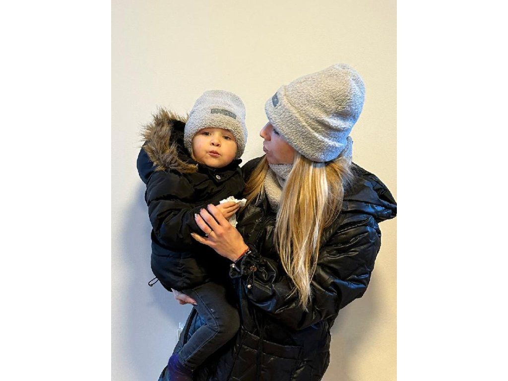 Výhodný set duo balenie čiapok pre mamičku/otecka a dieťa.Mäkučká čiapka z medvedíkového úpletu zdobená koženkovým štítkom.