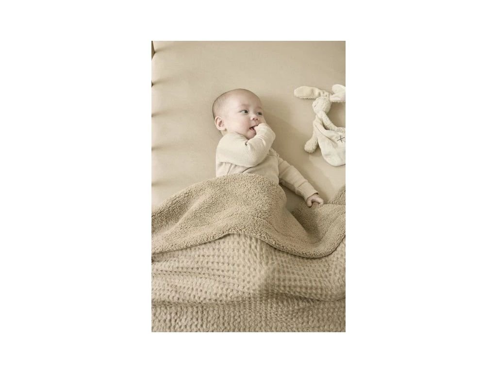 Deka je vyrobená zo 100% nebielenej bavlnenej vaflovej tkaniny na prednej strane. Úžasne mäkká spodná strana je vyrobená zo 100% polyesterového teddy fleece. Nebielená bavlna sa vyrába bez použitia škodlivých chemikálií a bielidiel, čo prispieva k udržateľnejšiemu svetu. Vďaka prirodzenej farbe a štruktúre bavlnených vlákien má prikrývka hodnotu TOG 2,0. Čím vyššia hodnota TOG, tým teplejšia.