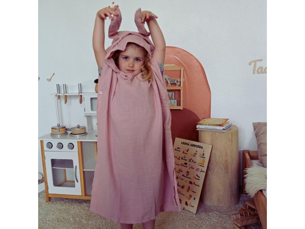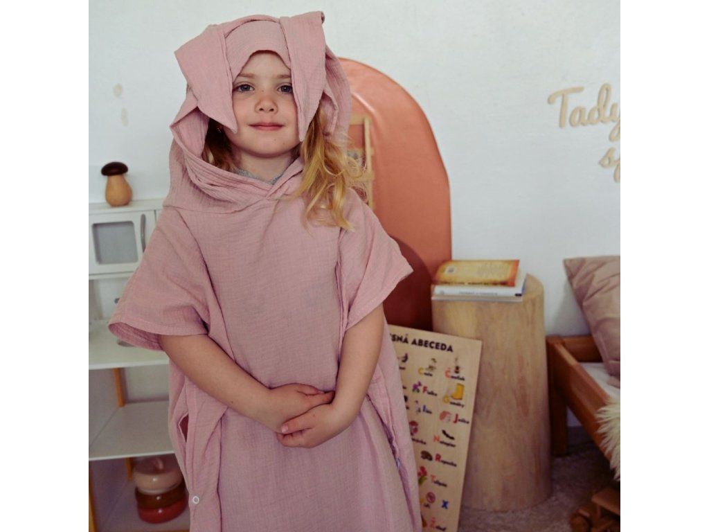 Detské mušelínové pončo New Baby Feeling. Štýlové pončo nielen na doma, ale aj na plávanie pri bazéniku, alebo pri vode. Mušelínové pončo je vďaka materiálu ľahké, vzdušné a krásne savé. Pončo bude chrániť dieťa pred chladom a poslúži aj ako jemná osuška. Vďaka voľnému jedinečnému strihu a roztomilým uškám urobí deťom veľkú radosť. Svojim strihom s dieťatkom porastie a padne na každú postavu. Vyzerá skvele a je možné využívať po celý rok. Pre ľahšie obliekanie a vyzliekanie sú na boku cvočky. Tým vznikne možnosť urobiť otvor na ruku, alebo nechať strih volný. Zloženie: mušelín-100% bavlna. Rozmer: 80 cm bez kapucne, šírka: 59 cm.