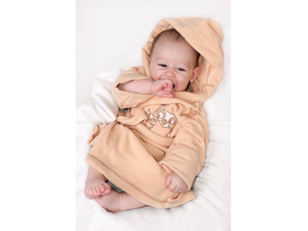 Detský župan New Baby Sovičky. Župan zdobí obrázok sovičiek, kapucňa a dve vrecká. Kapucňa chráni mokrú hlavičku pred chladom a mäkký, teplý materiál je ideálny pre citlivú detskú pokožku. Detský župan sa zaväzuje na šnúrky. Rozmer: dĺžka od ramienok cca 68 cm, obvod okolo hrudníka cca 82 cm, dĺžka rukáva cca 35 cm. Zloženie 100% polyester.